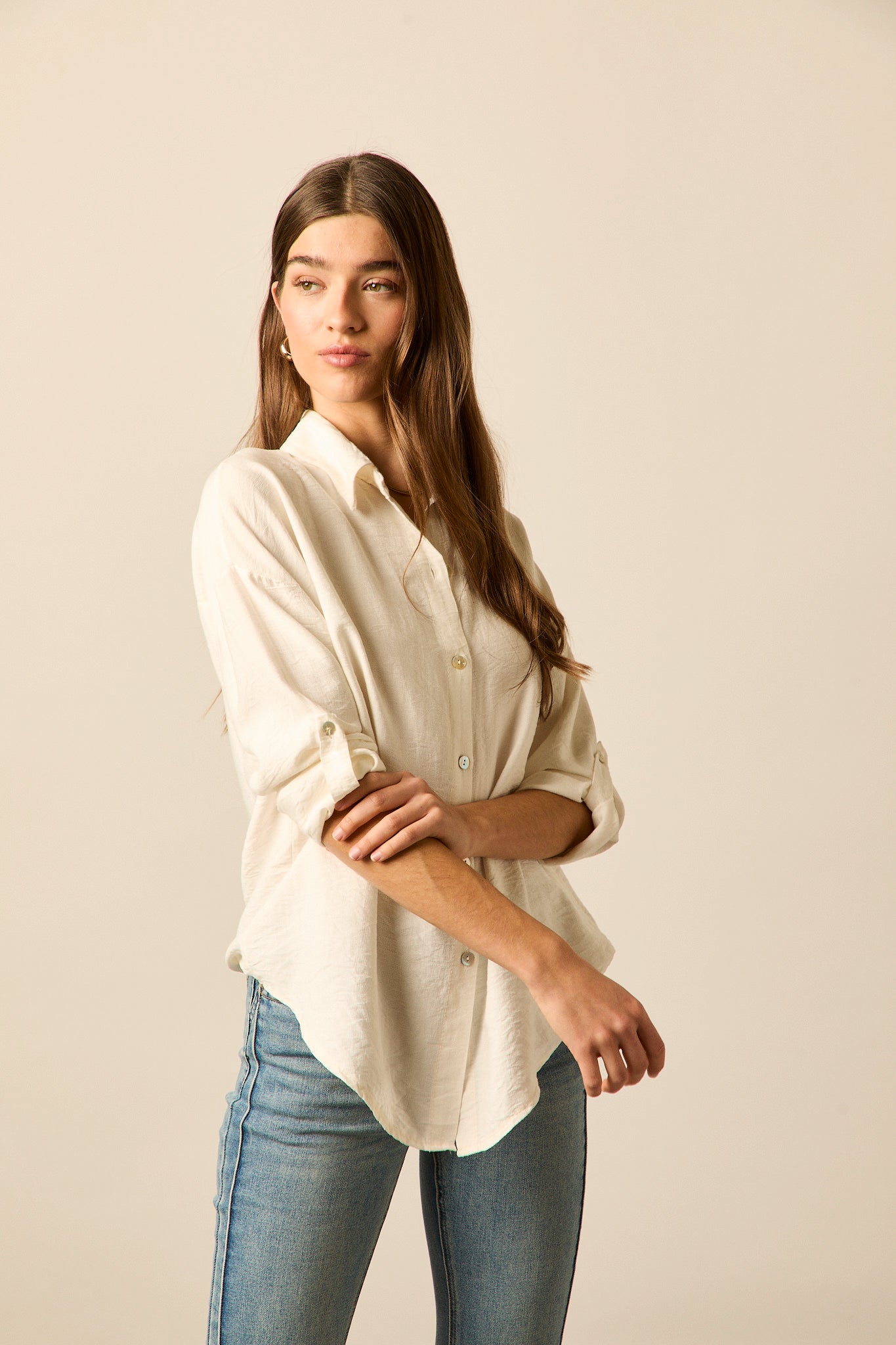 Blusa larga en color blando. Cuello de solapa, manga larga ajustable con botón. Diseño fluido y cierre frontal de botones.