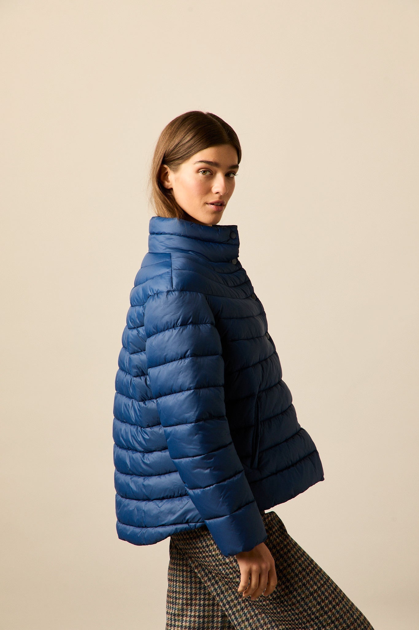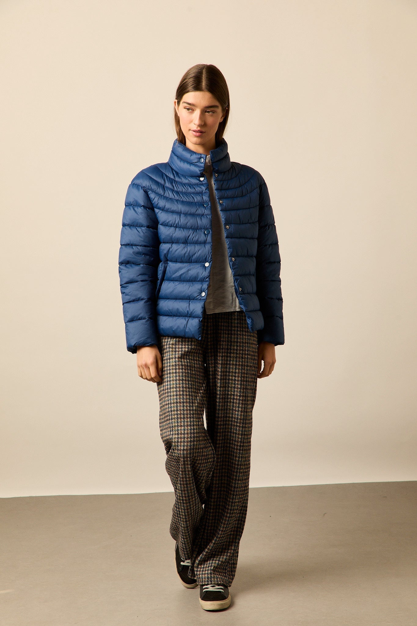 Plumífero en tono azul intenso con diseño de franjas horizontales. Corte recto, cuello alto y cierre frontal con botones a presión. Manga larga y bolsillos laterales integrados.