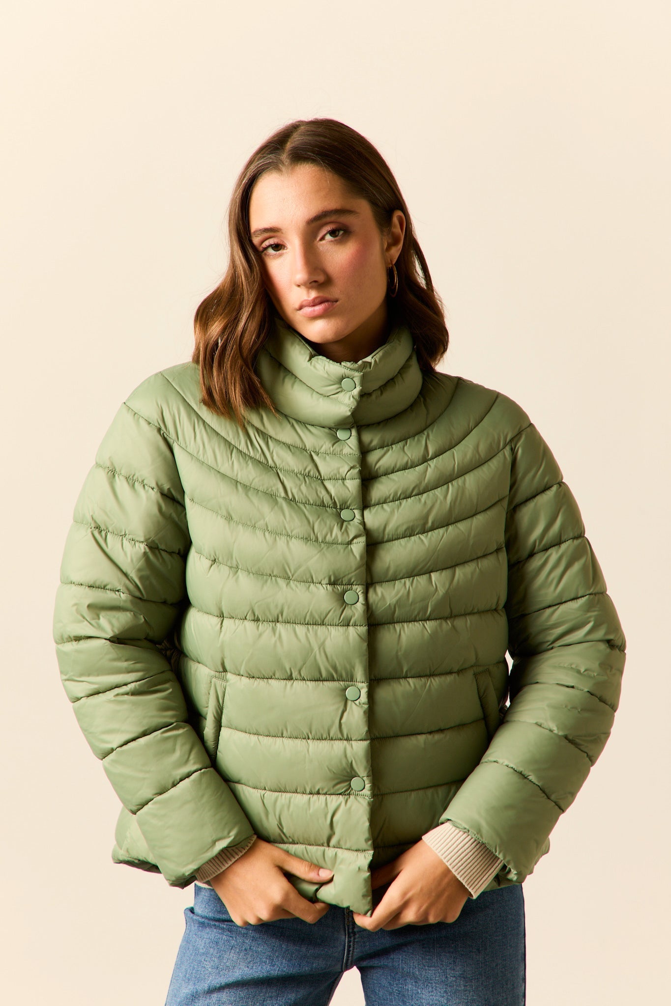 Plumífero en tono verde suave con diseño de franjas horizontales. Corte recto, cuello alto y cierre frontal con botones a presión. Manga larga y bolsillos laterales integrados.