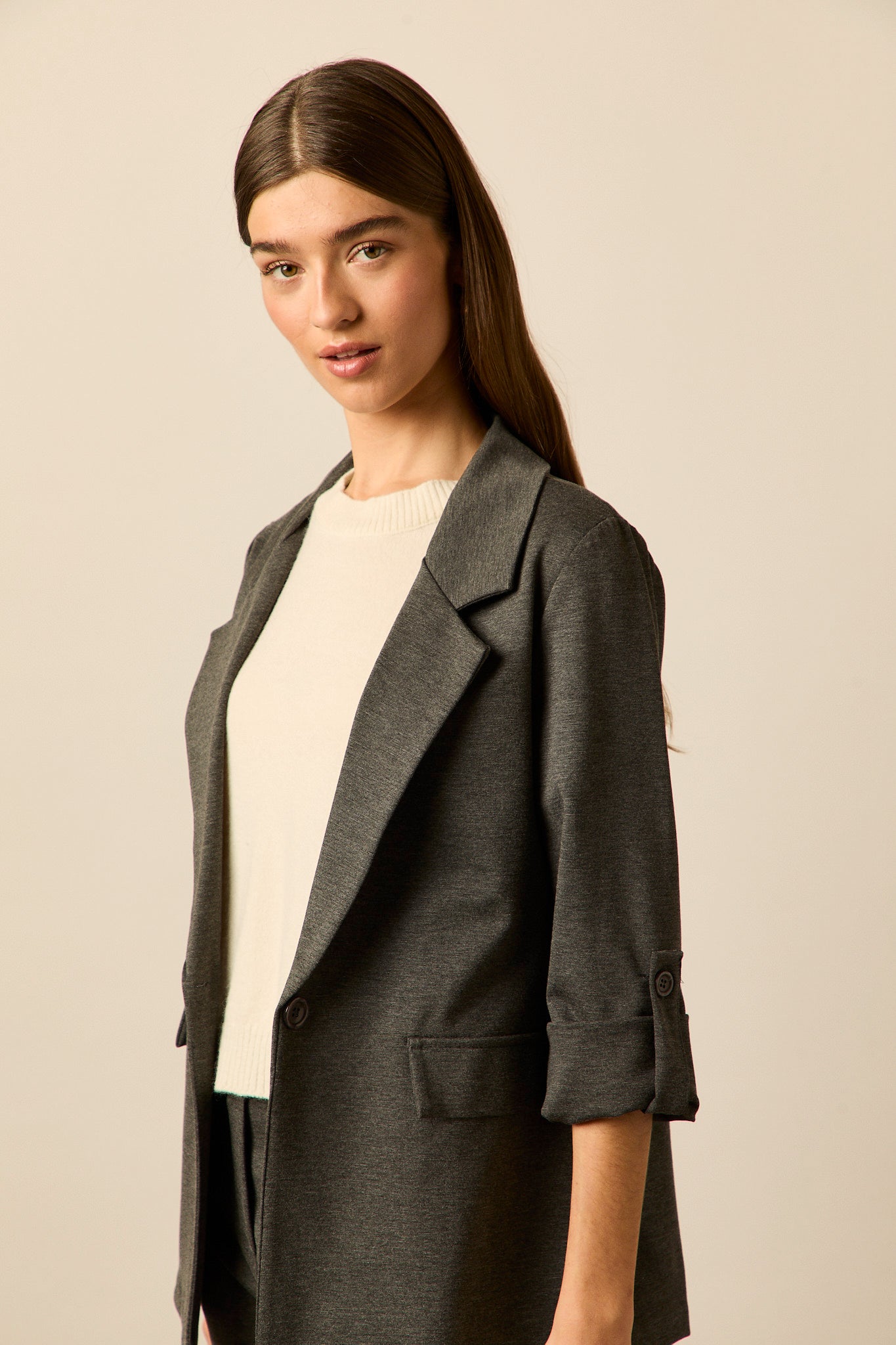 Blazer sastre en color gris. Cuello de solapa, falsos bolsillos laterales, manga larga ajustable con botón y cierre de un botón.