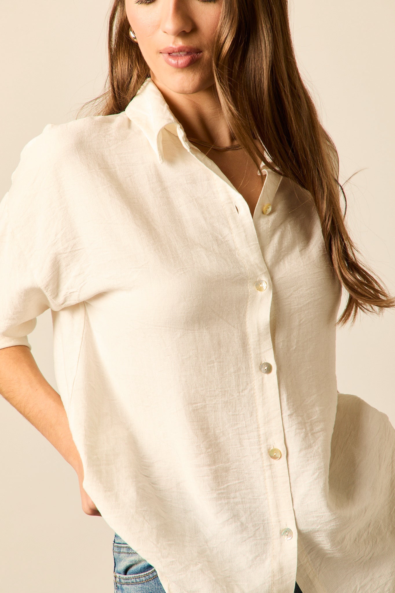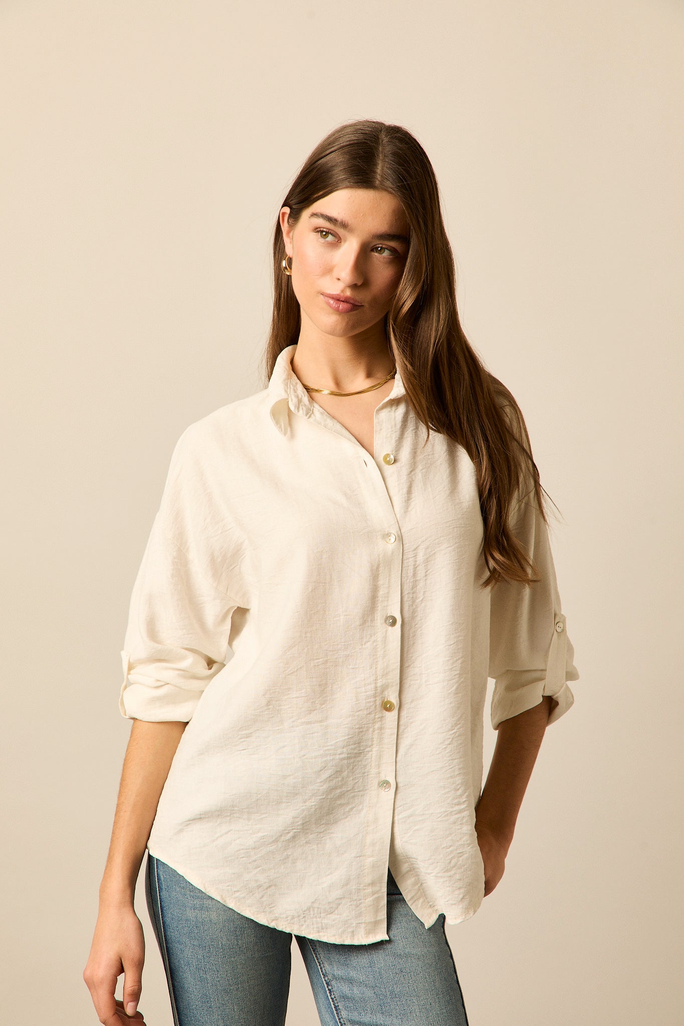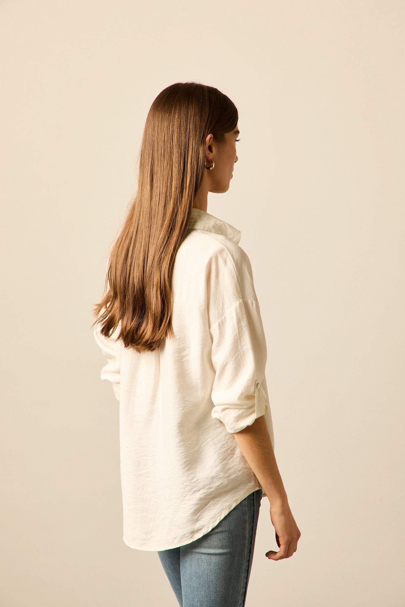 Blusa larga en color blando. Cuello de solapa, manga larga ajustable con botón. Diseño fluido y cierre frontal de botones.