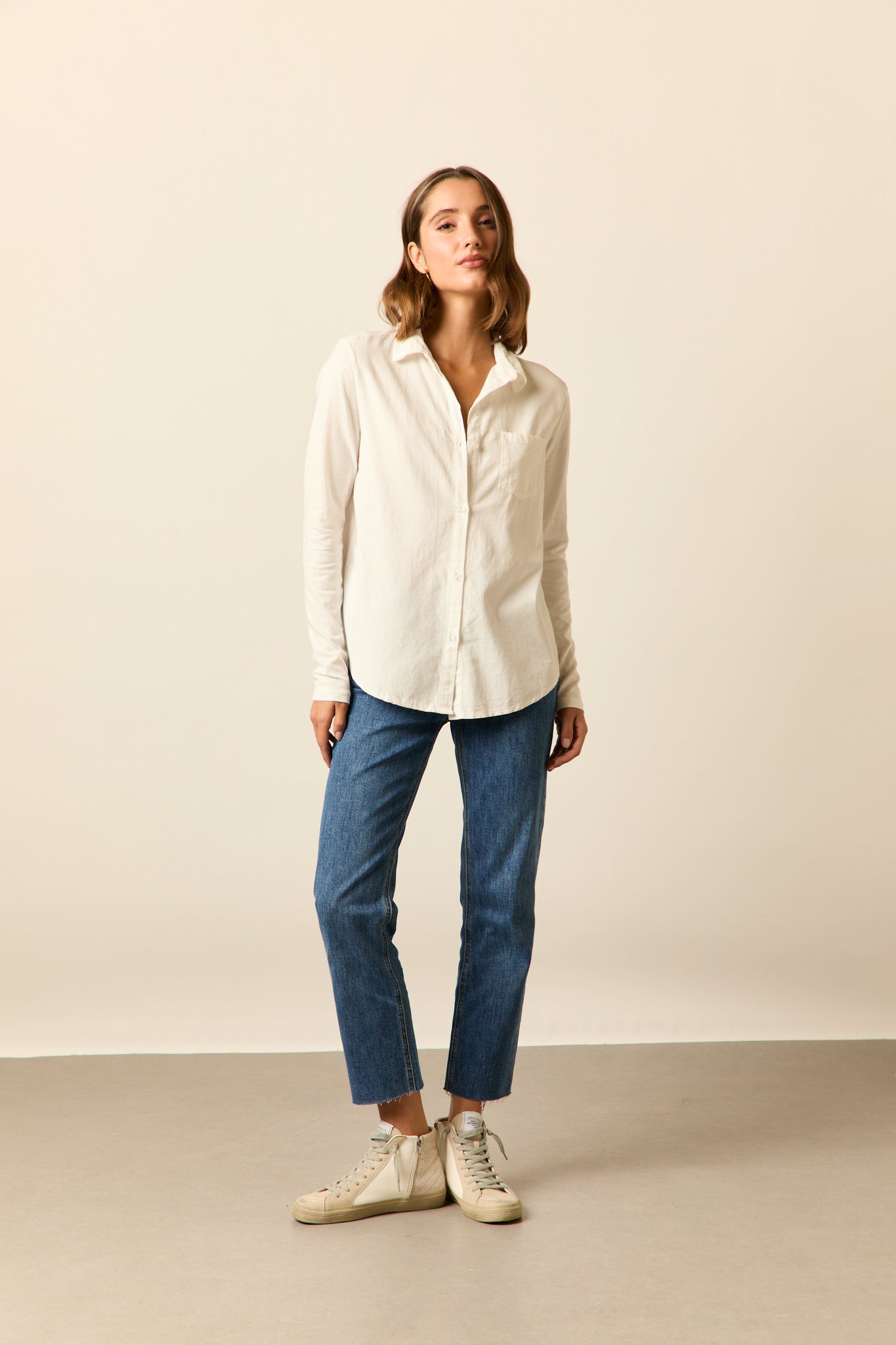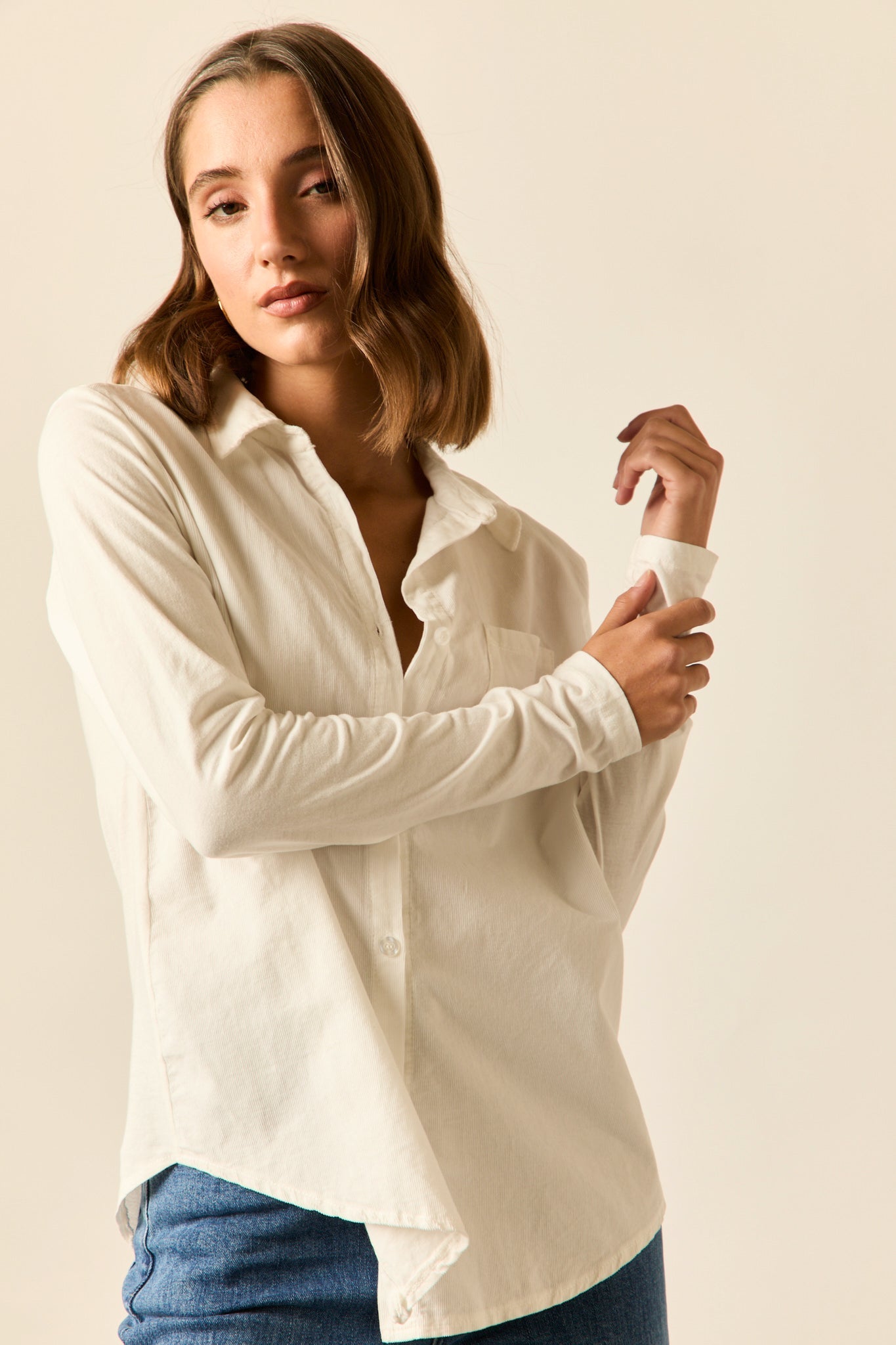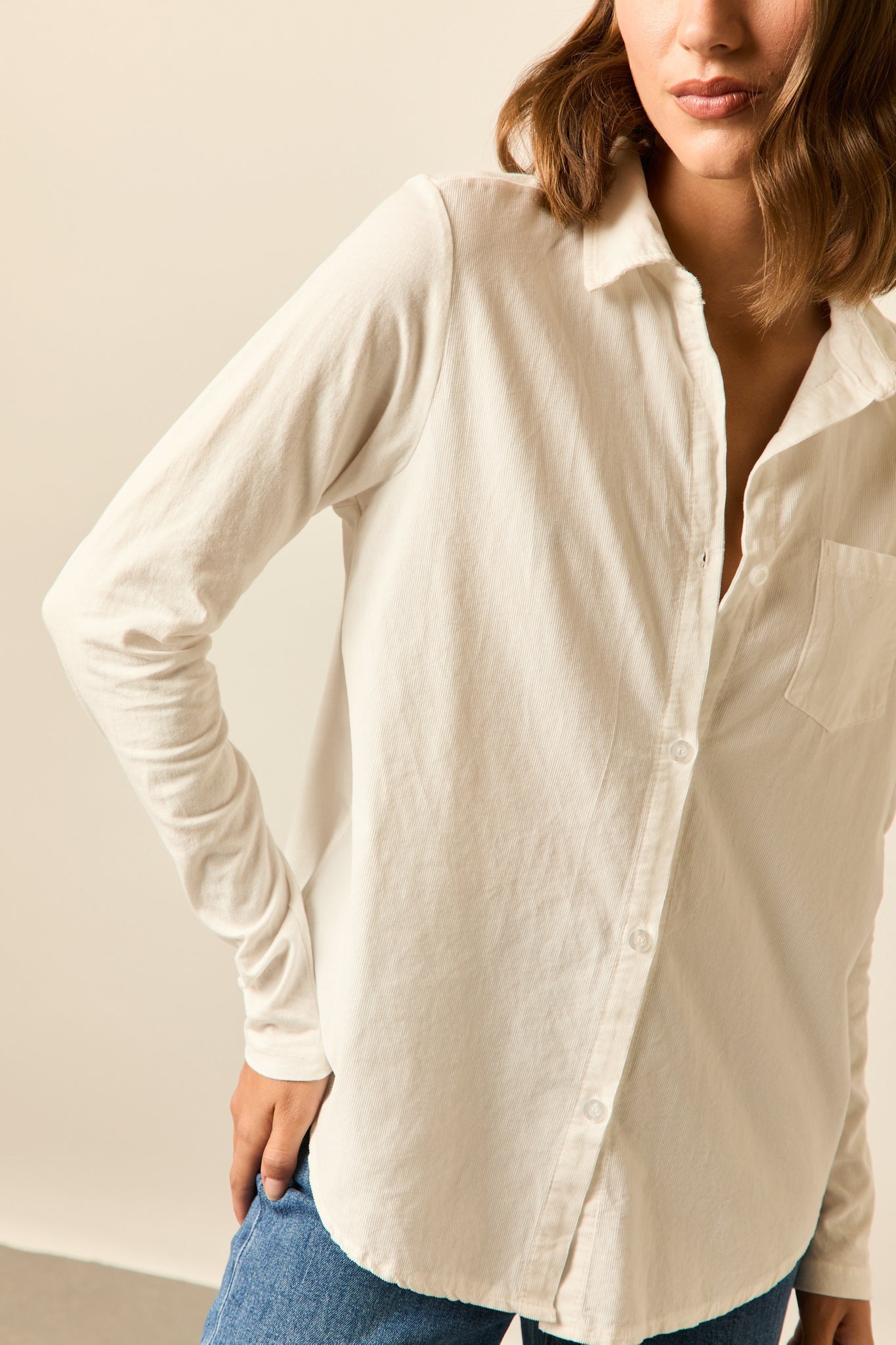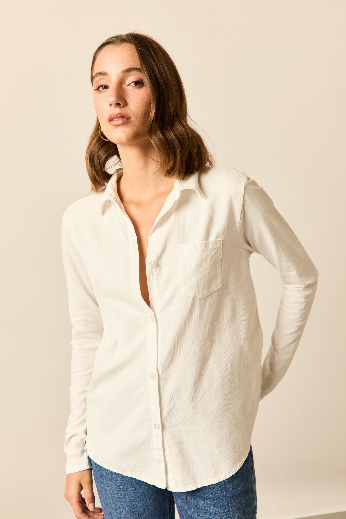 Camisa de micropana en color blanco. Cuello de solapa, manga larga y cierre frontal de botones.