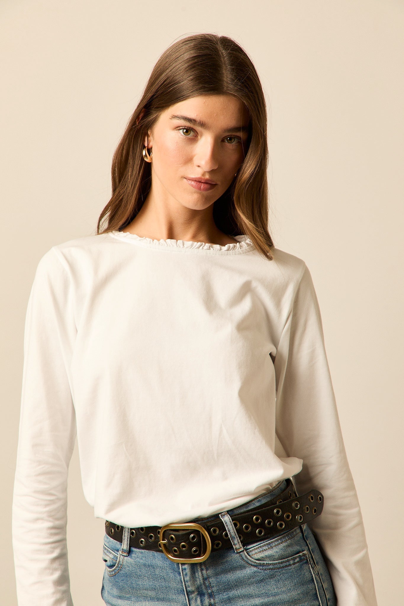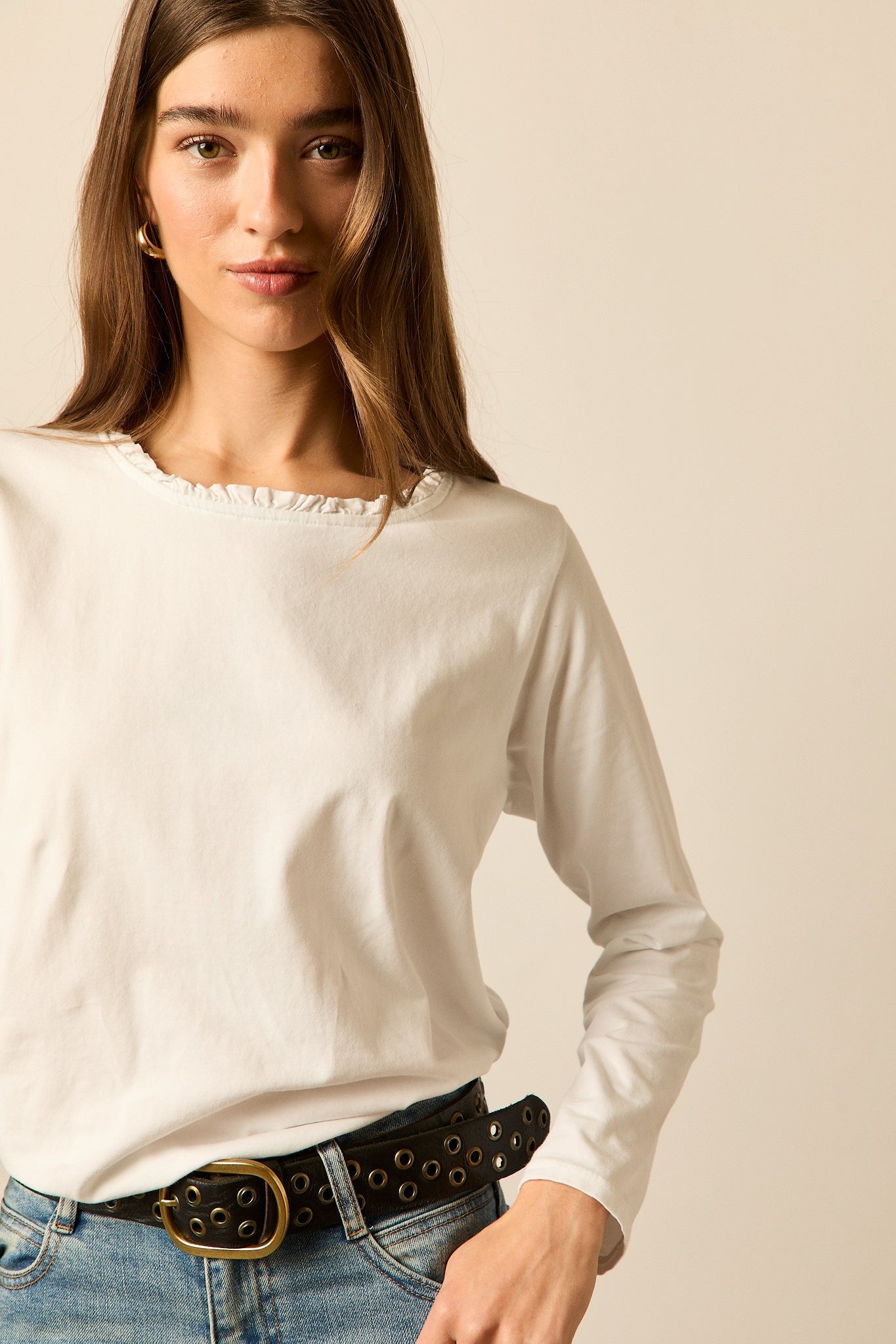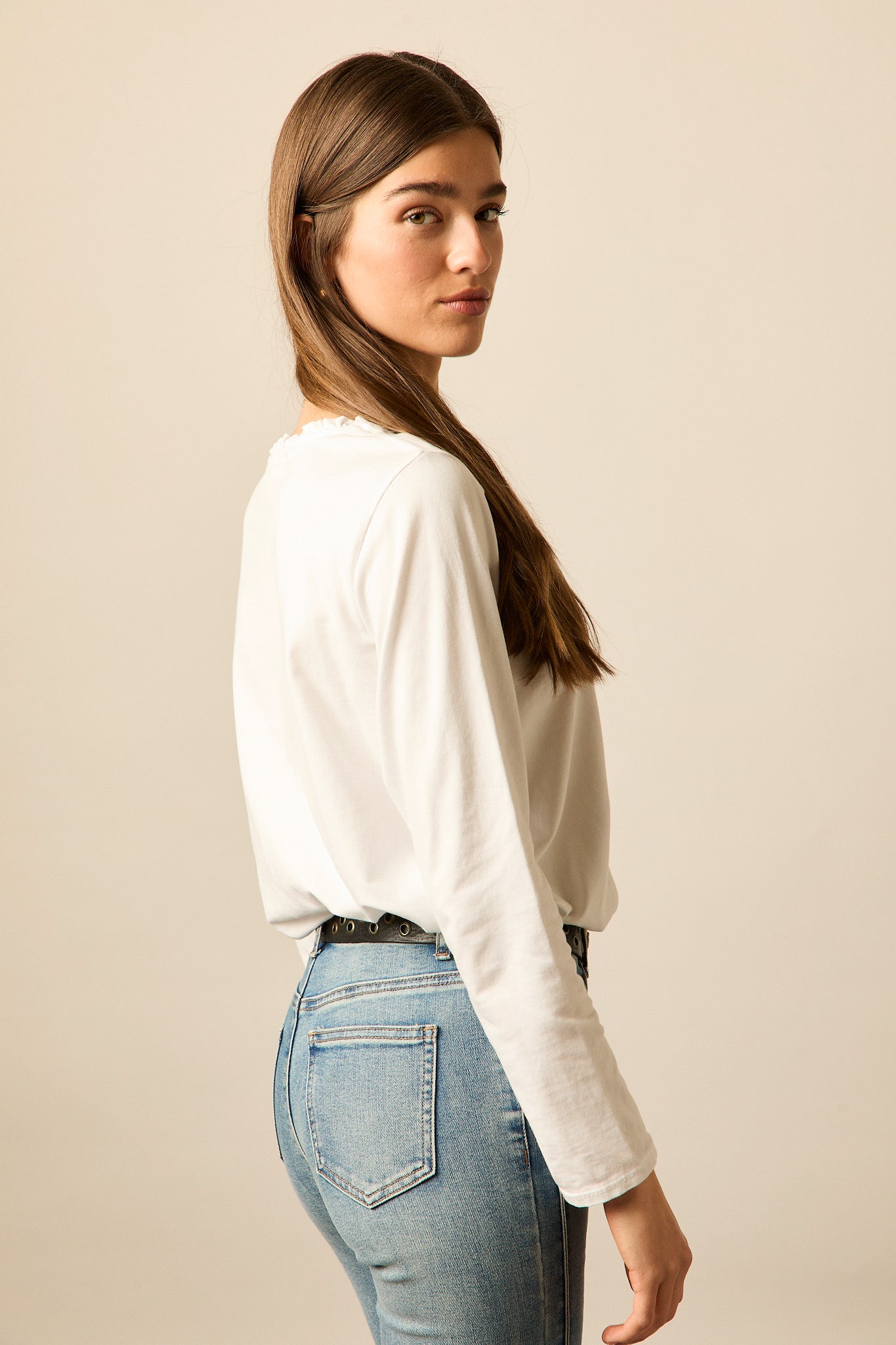 Camiseta básica de manga larga en color blanco. Cuello caja con detalle de volantes y diseño recto.