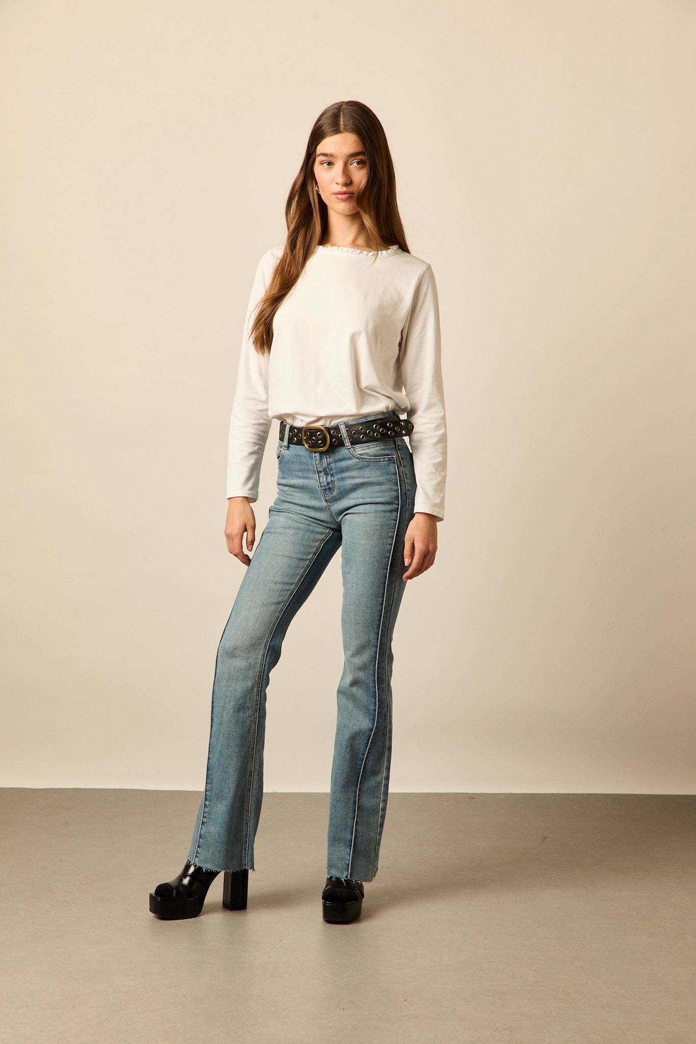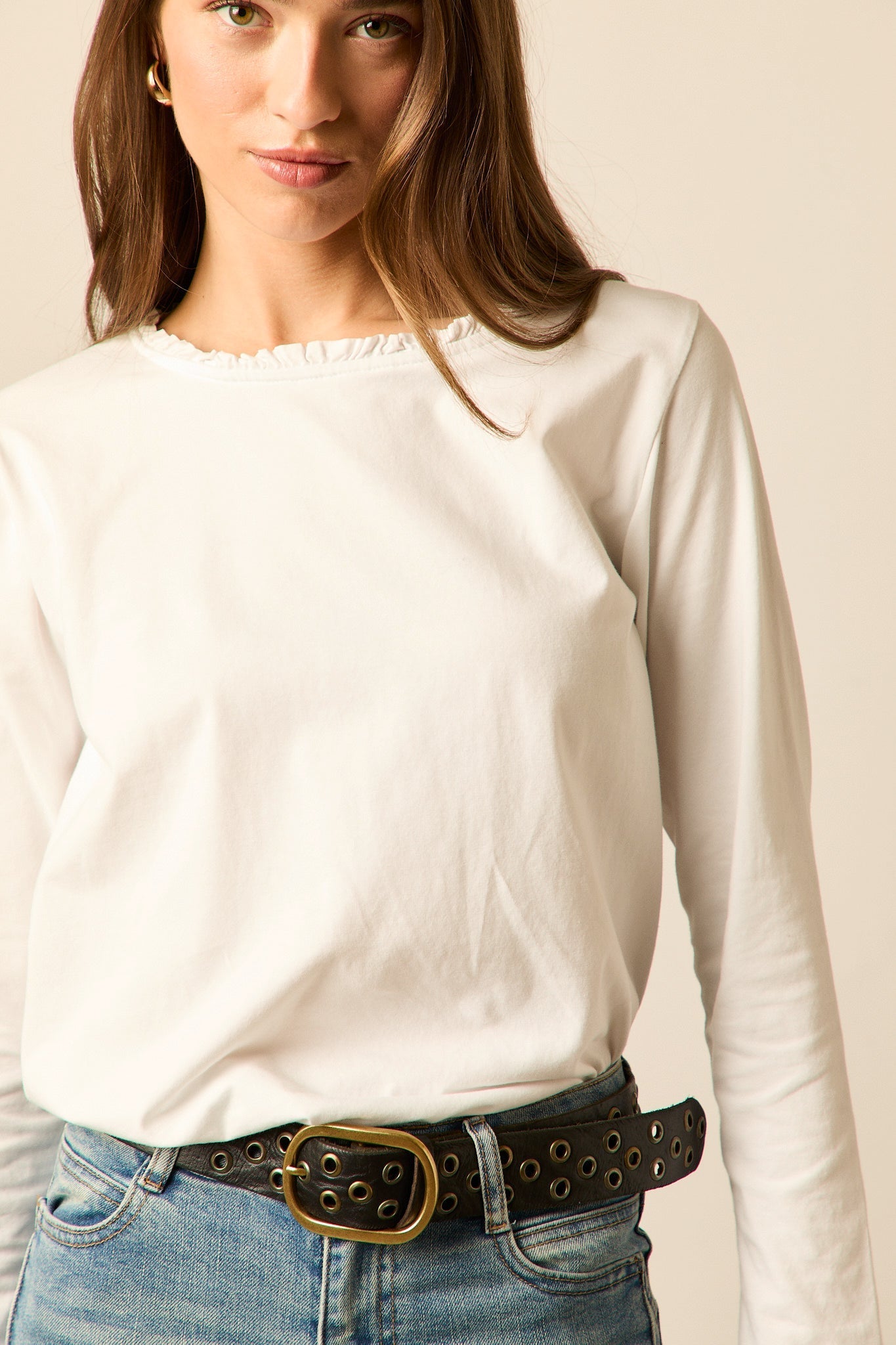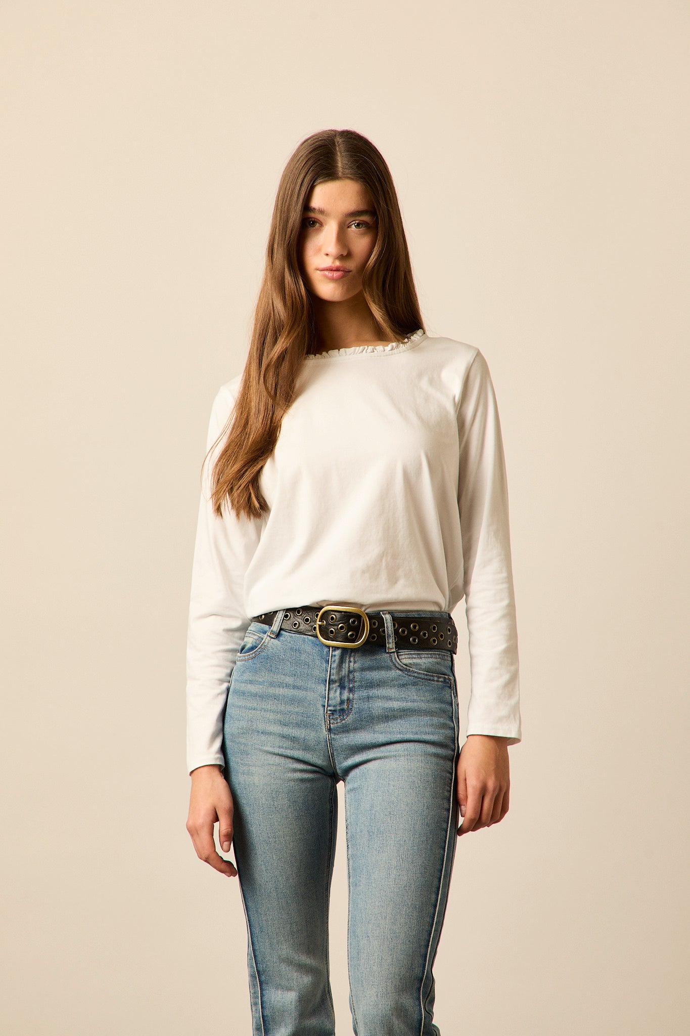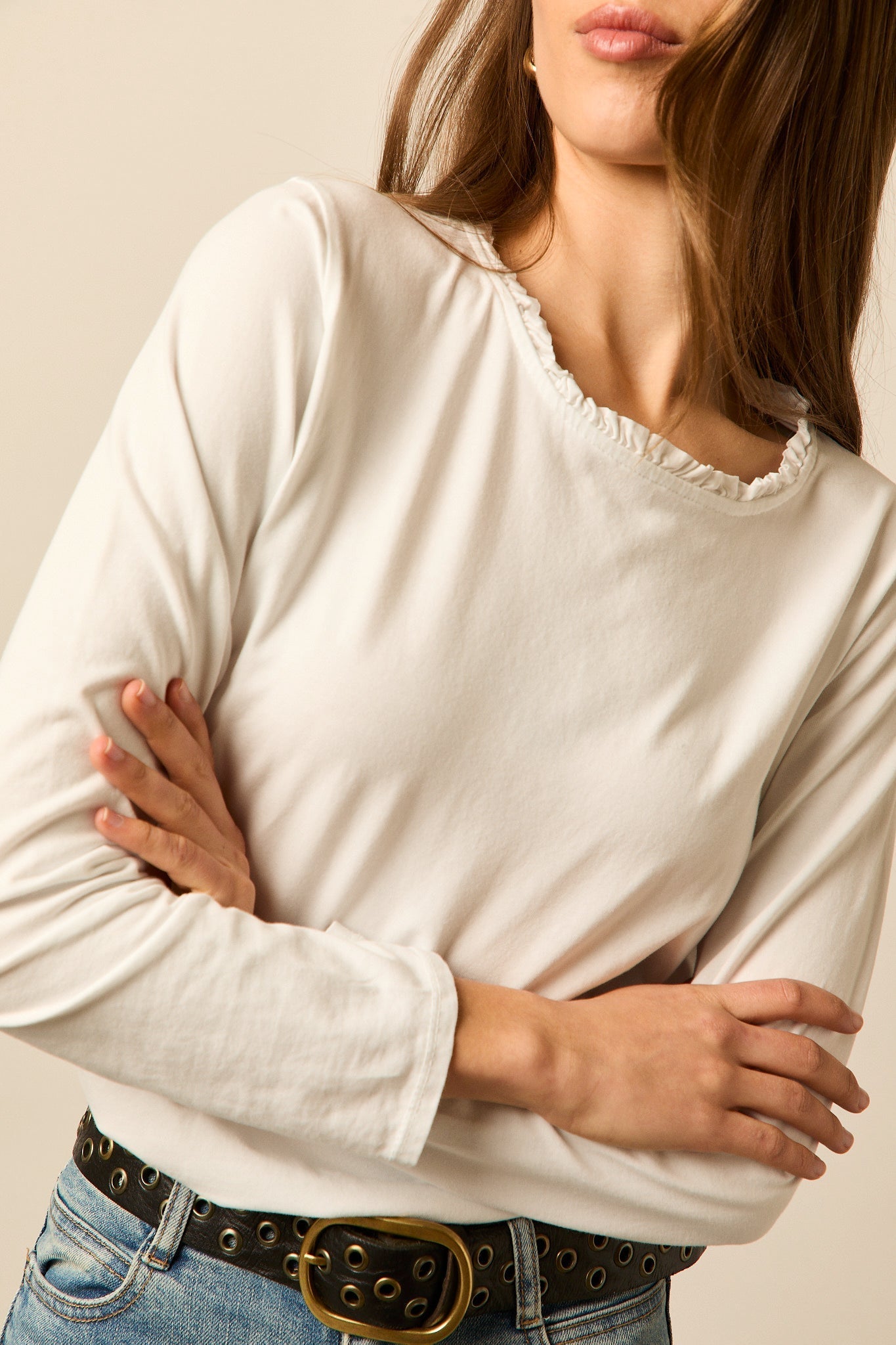 Camiseta básica de manga larga en color blanco. Cuello caja con detalle de volantes y diseño recto.
