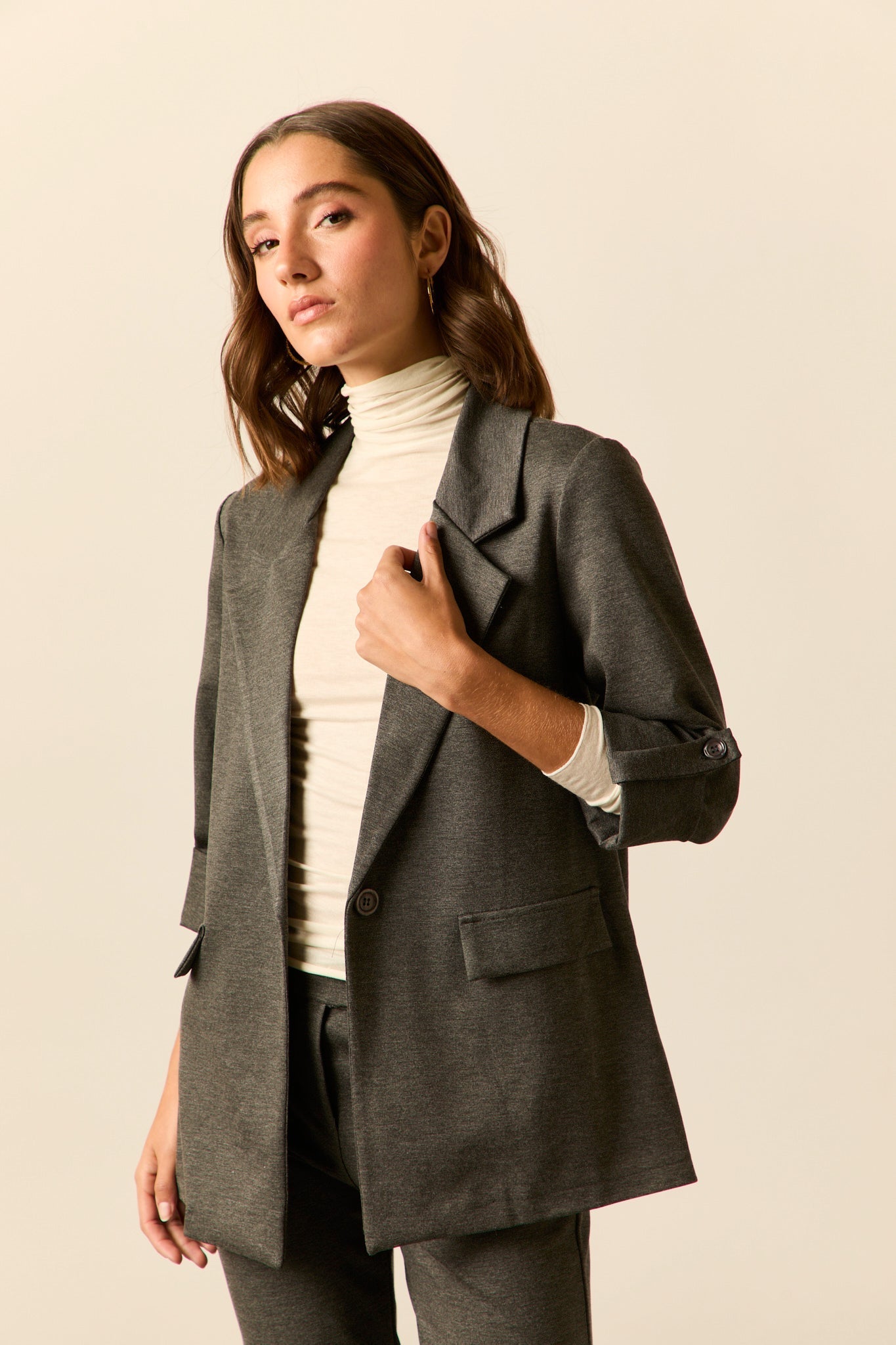 Camiseta segunda piel con composición de cashmere en color crema. Cuello vuelto, manga larga y diseño entallado.