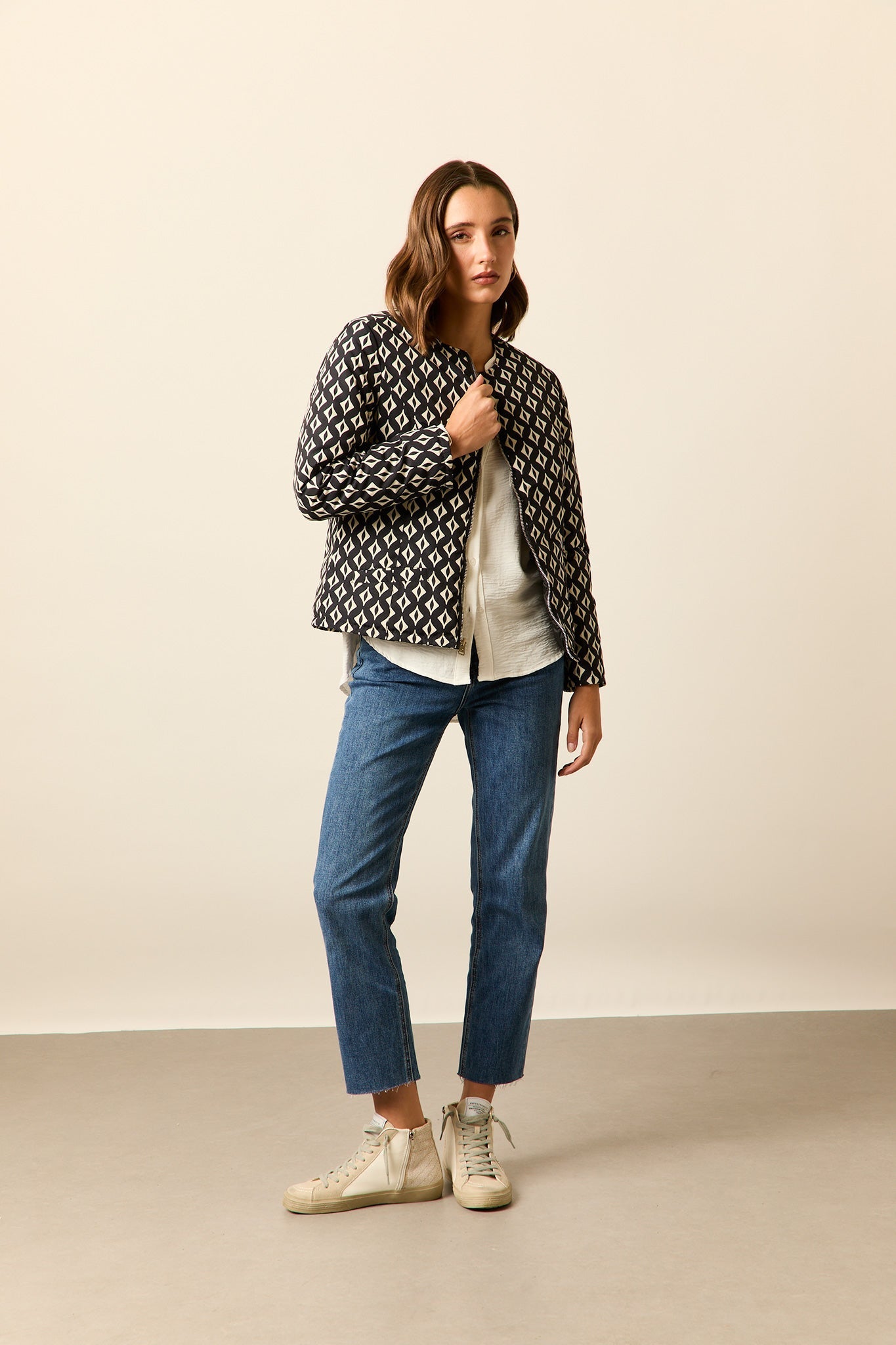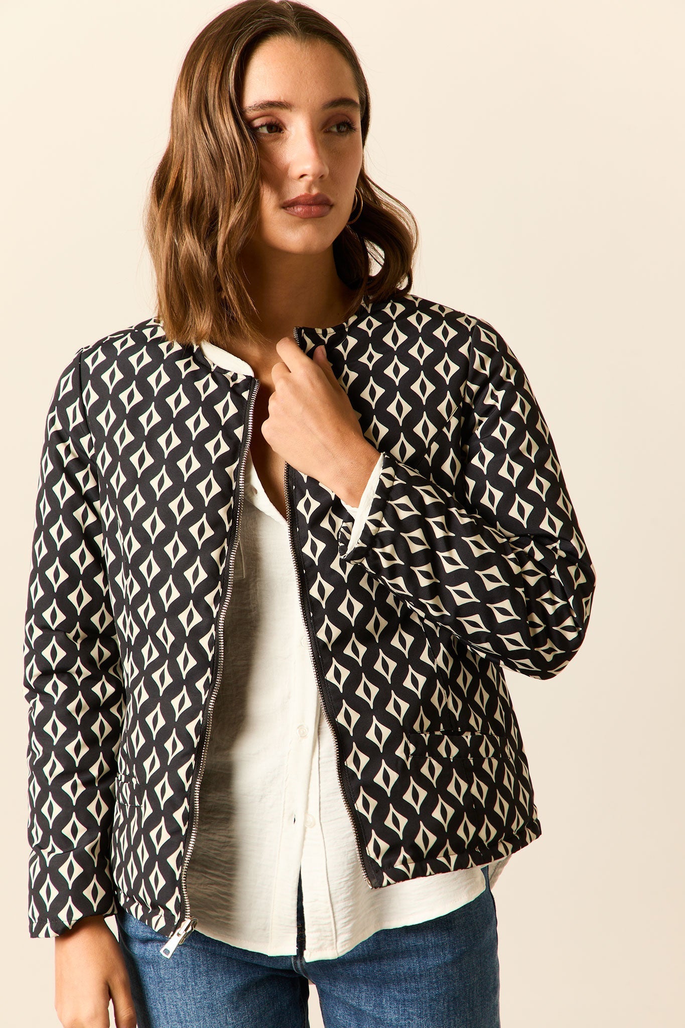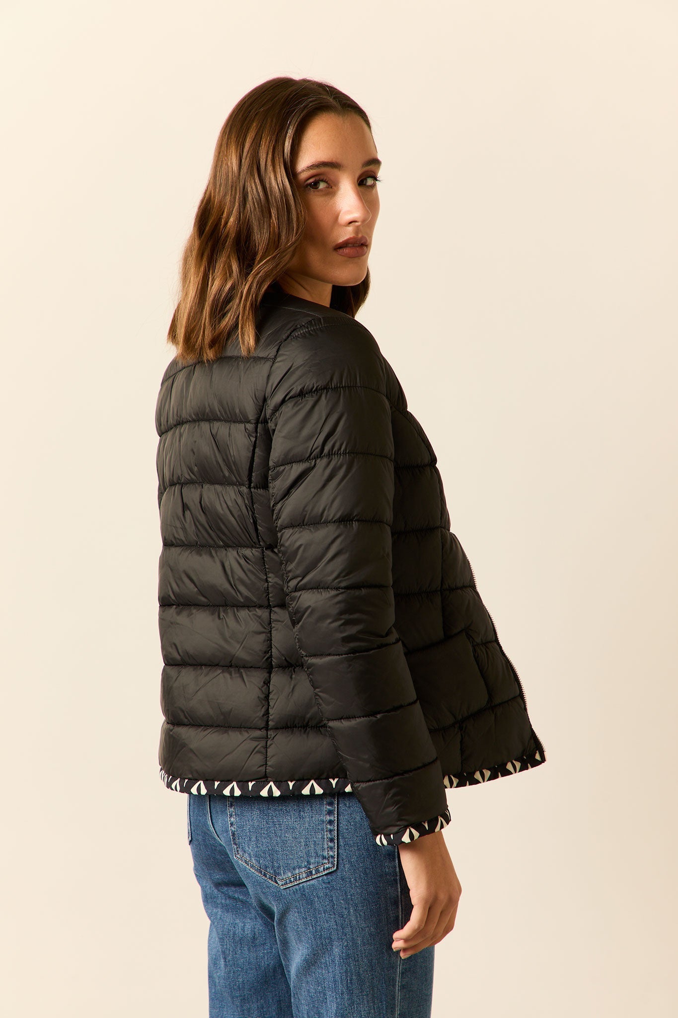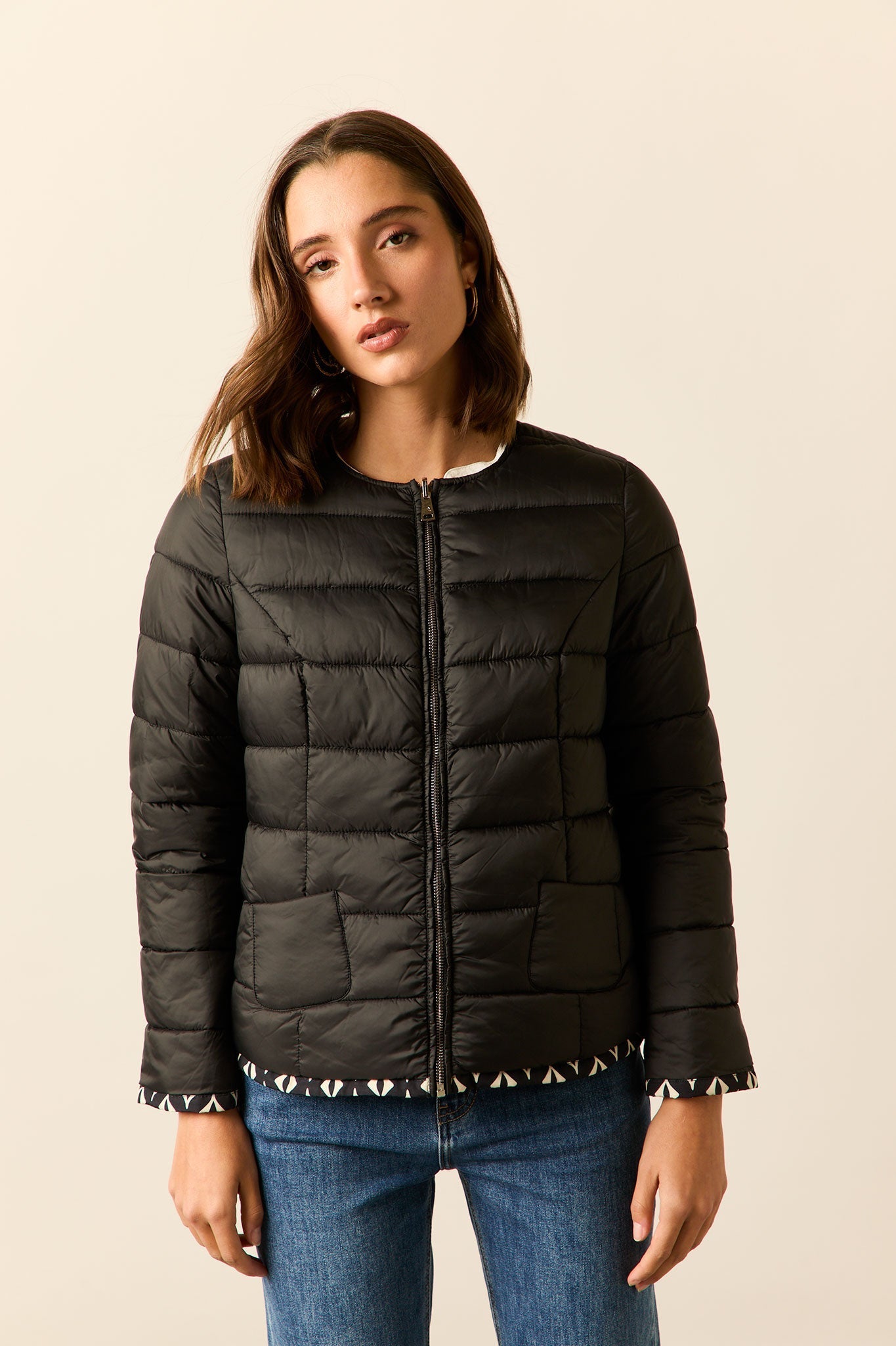 Cazadora acolchado reversible en color azul marino y print rombos beige. Cuello caja, manga larga, bolsillos laterales y cierre frontal de cremallera.
