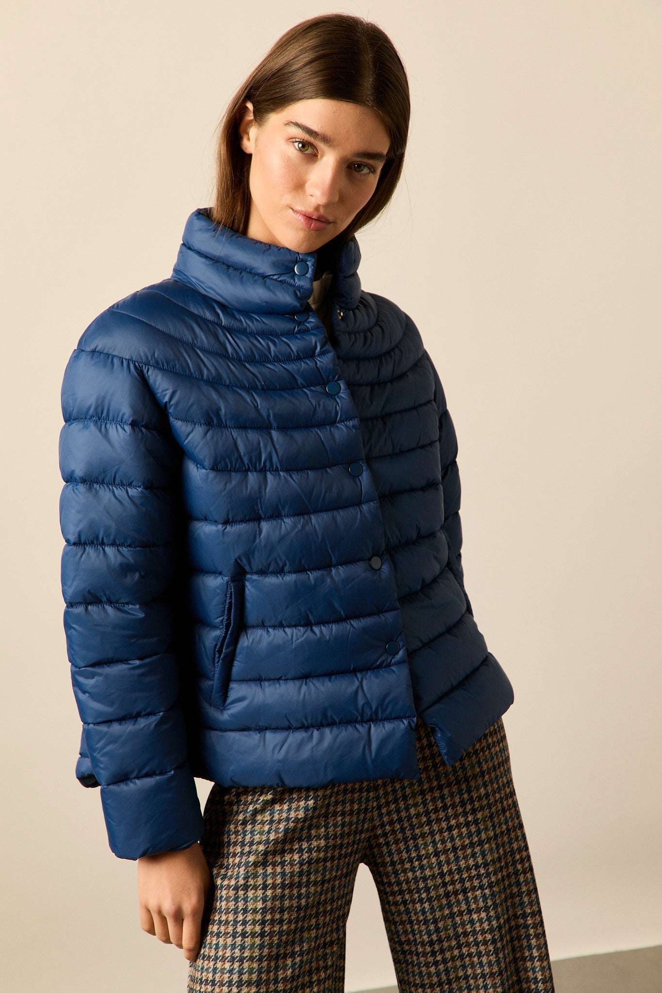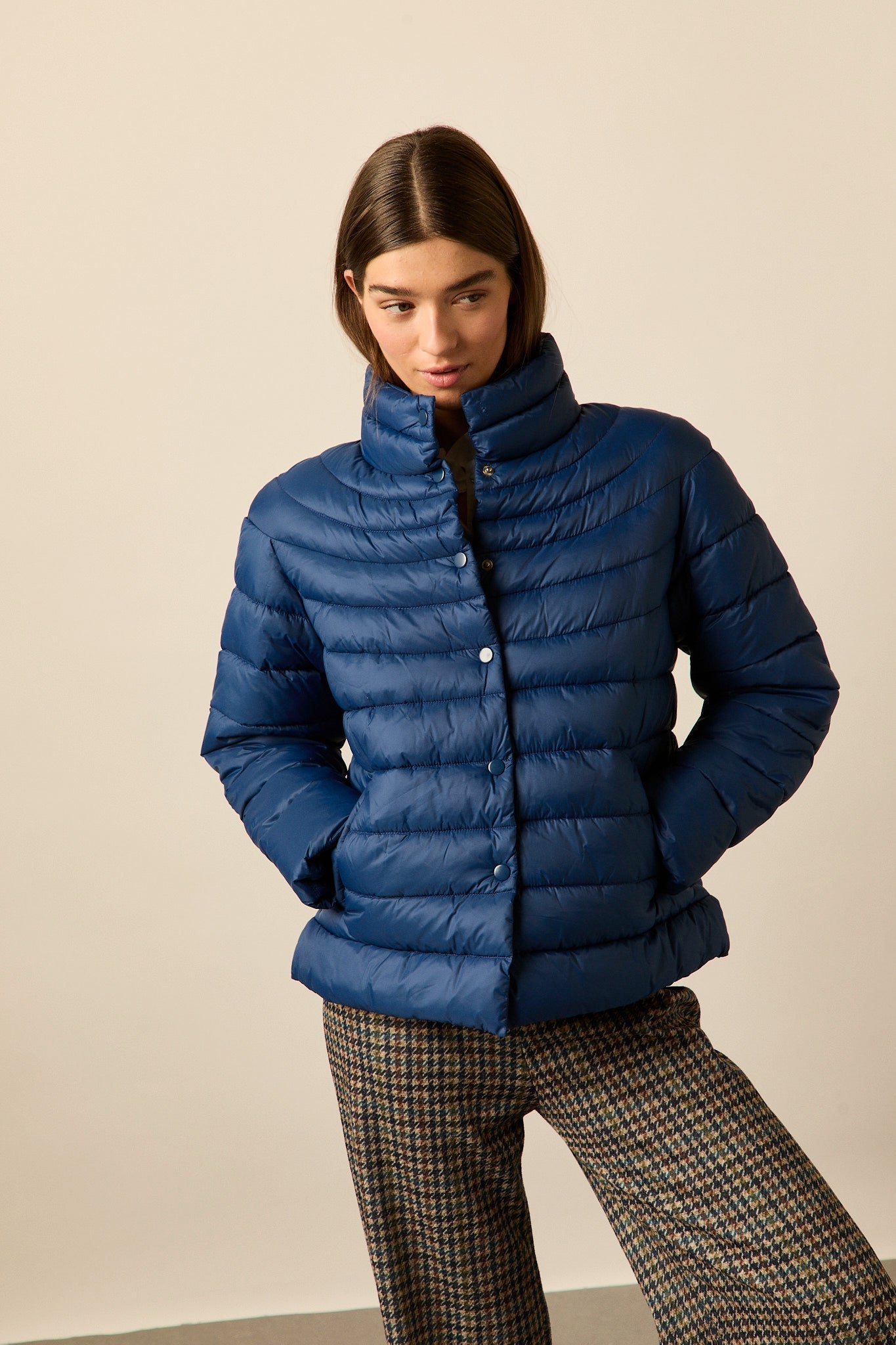 Plumífero en tono azul intenso con diseño de franjas horizontales. Corte recto, cuello alto y cierre frontal con botones a presión. Manga larga y bolsillos laterales integrados.