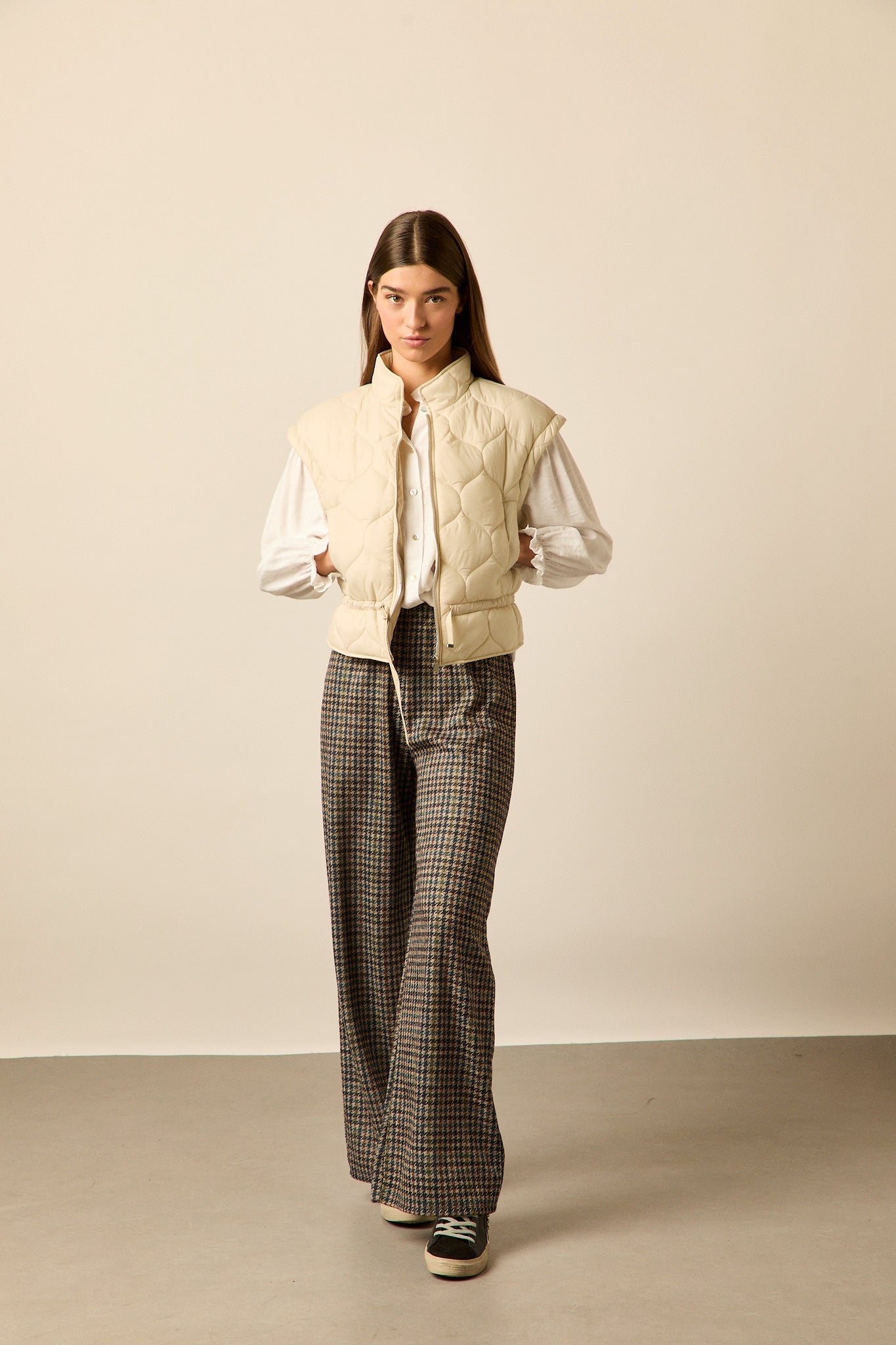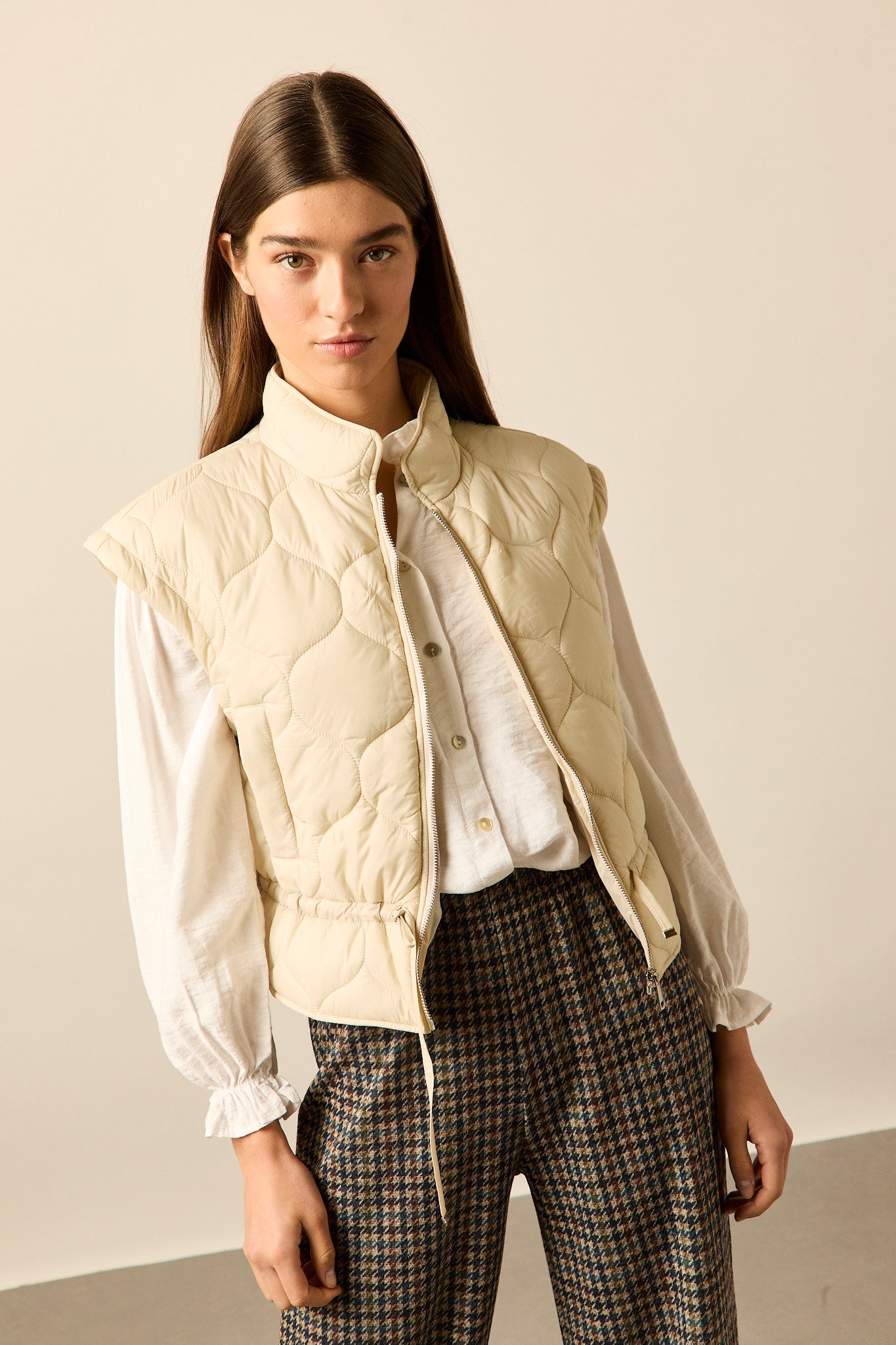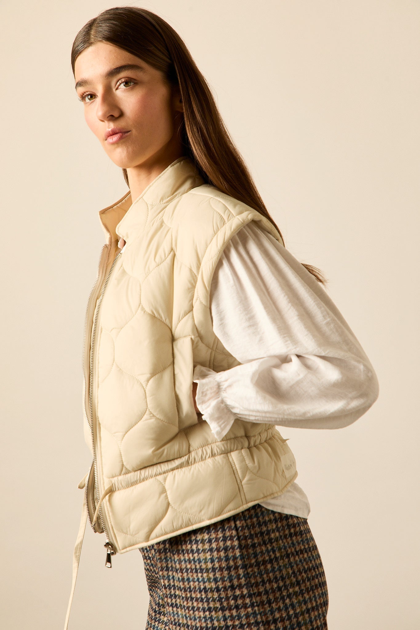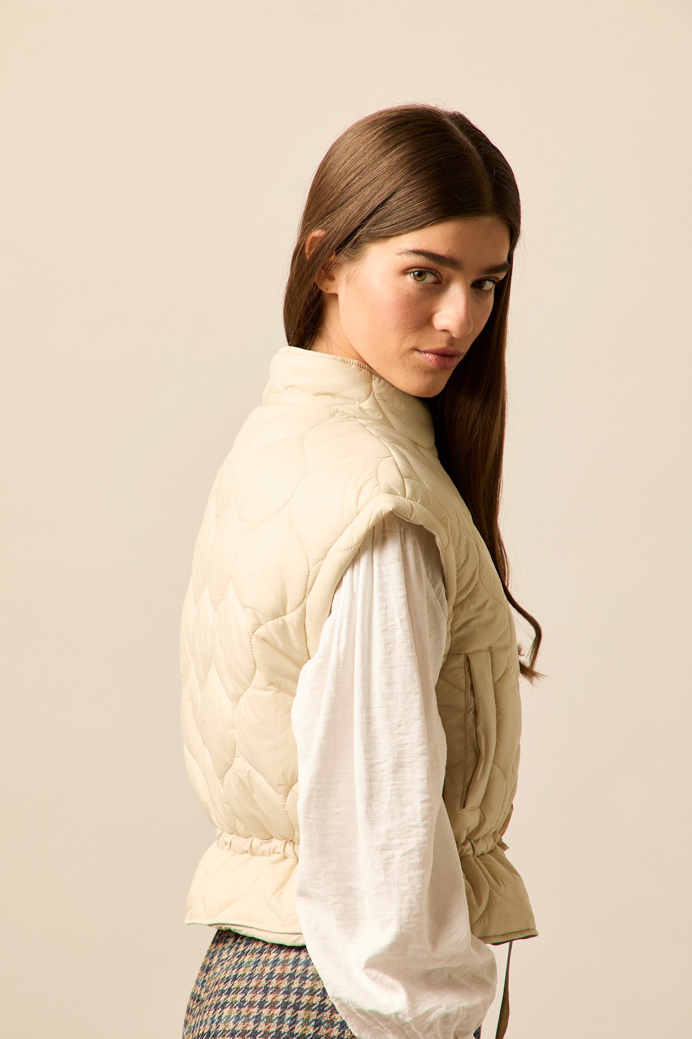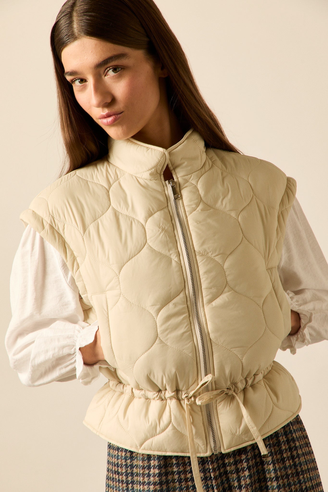 Chaleco acolchado en tono beige con diseño de pespuntes curvos. Corte recto, cuello alto y cierre frontal con cremallera metálica. Incluye ajuste con cordón en la cintura para una silueta personalizada.