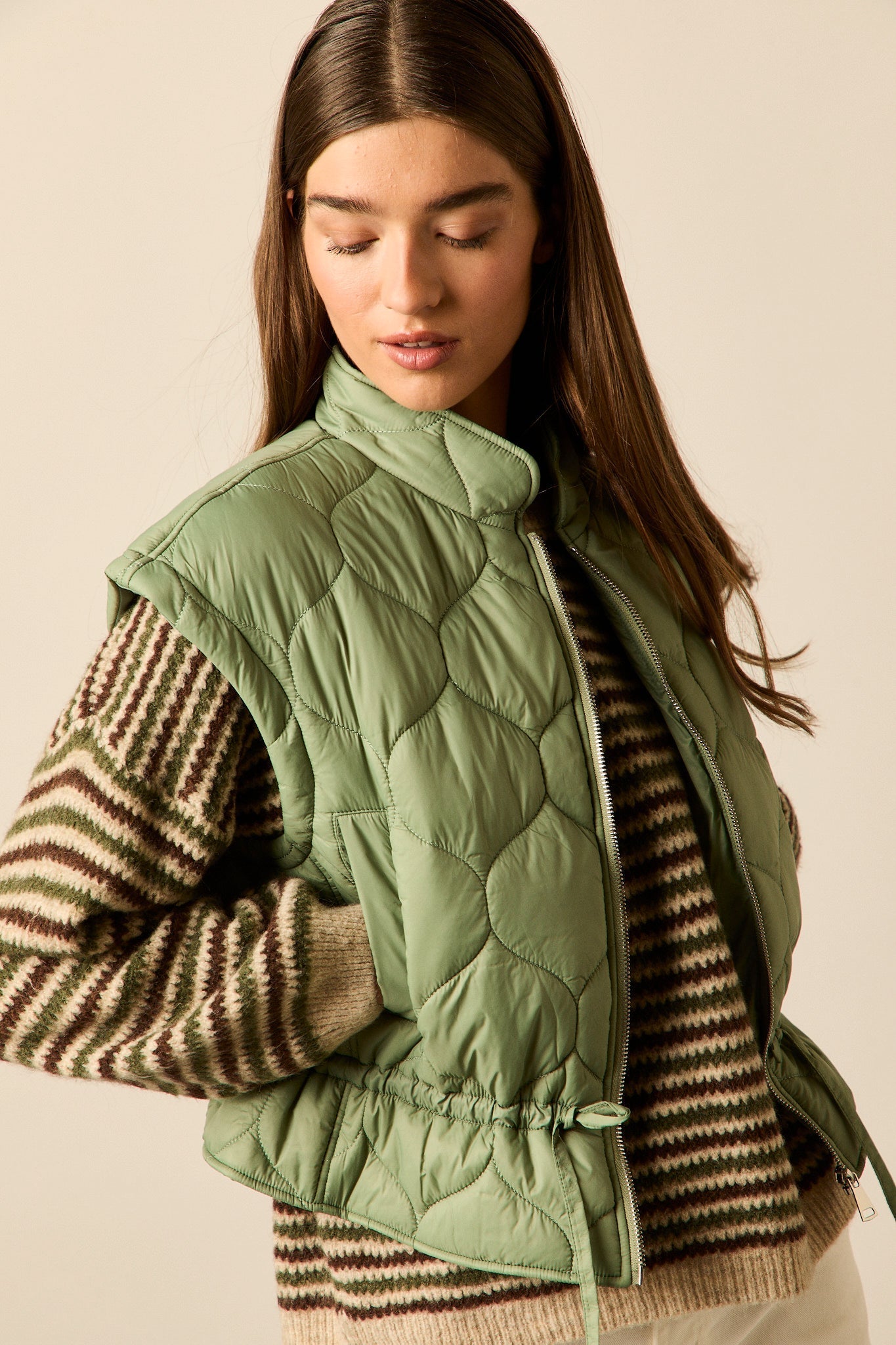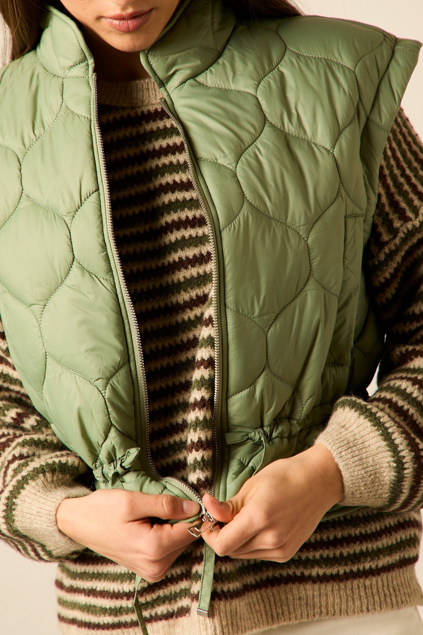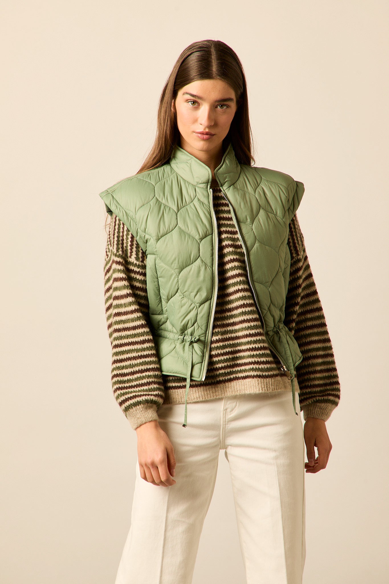 Chaleco acolchado en tono verde oliva con diseño de pespuntes curvos. Corte recto, cuello alto y cierre frontal con cremallera metálica. Incluye ajuste con cordón en la cintura para realzar la silueta.