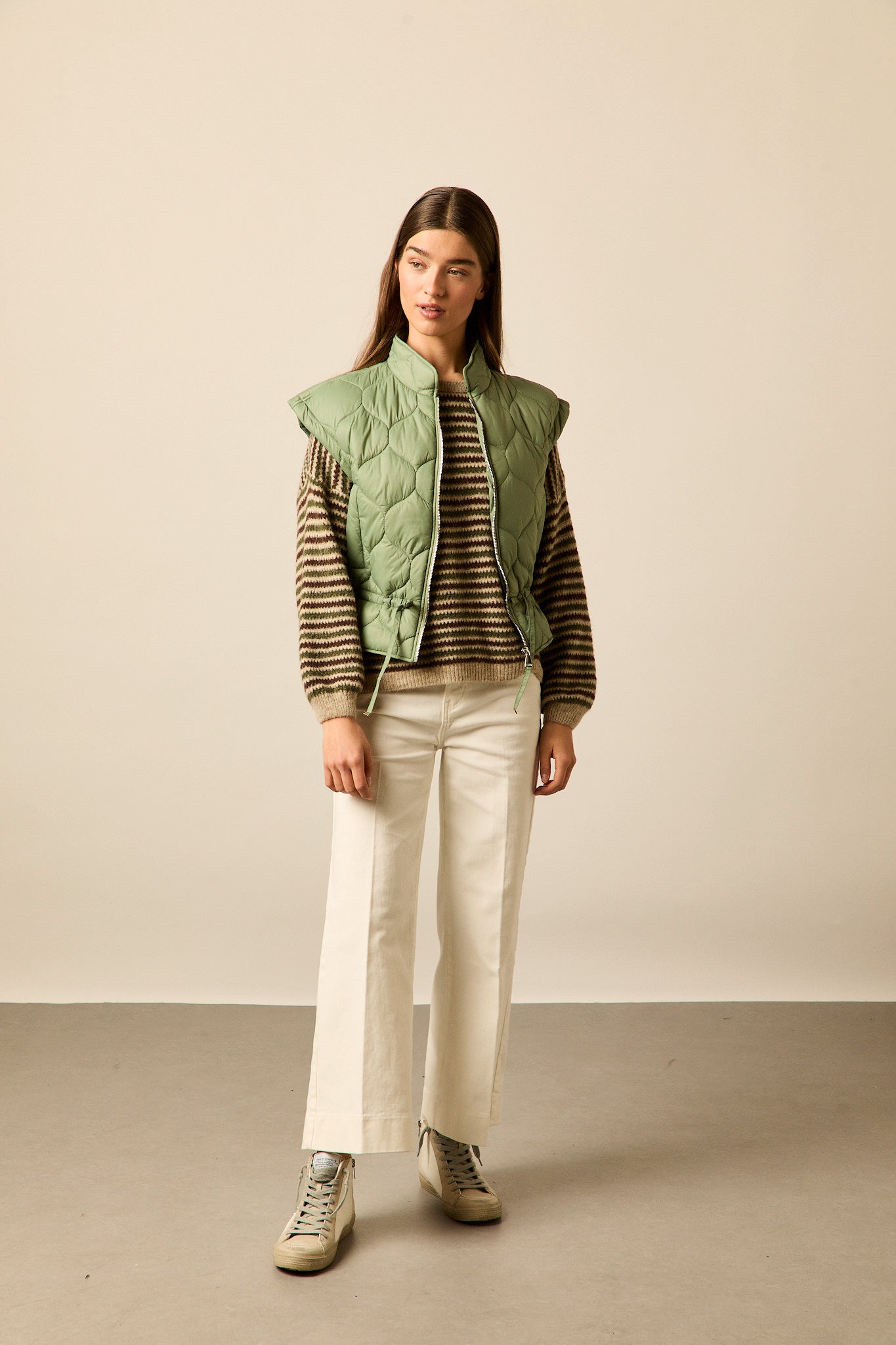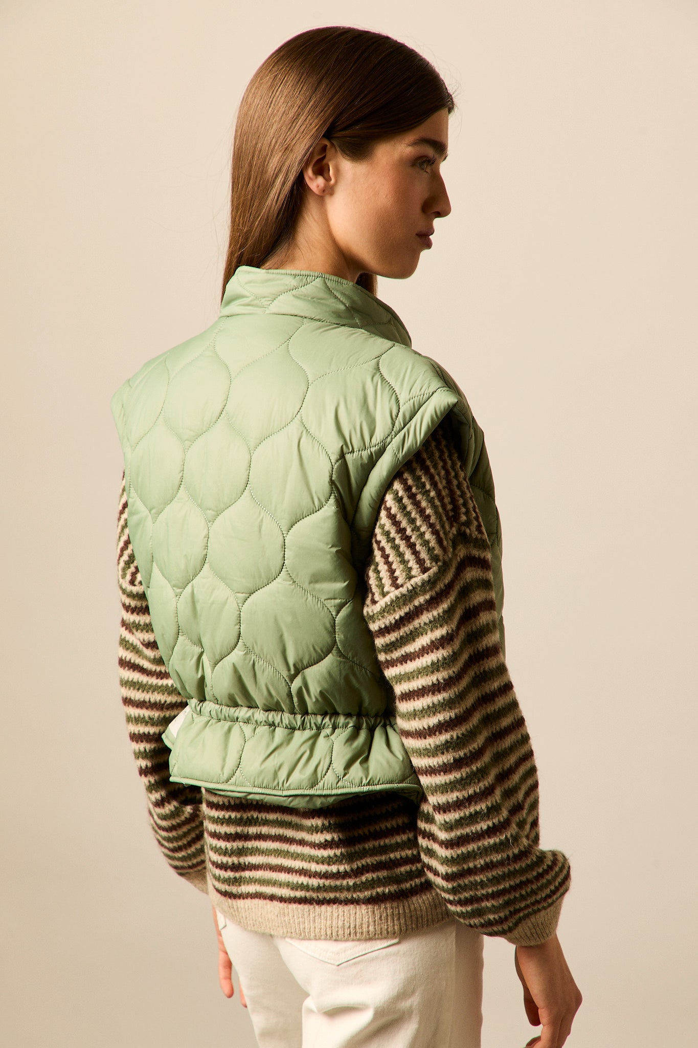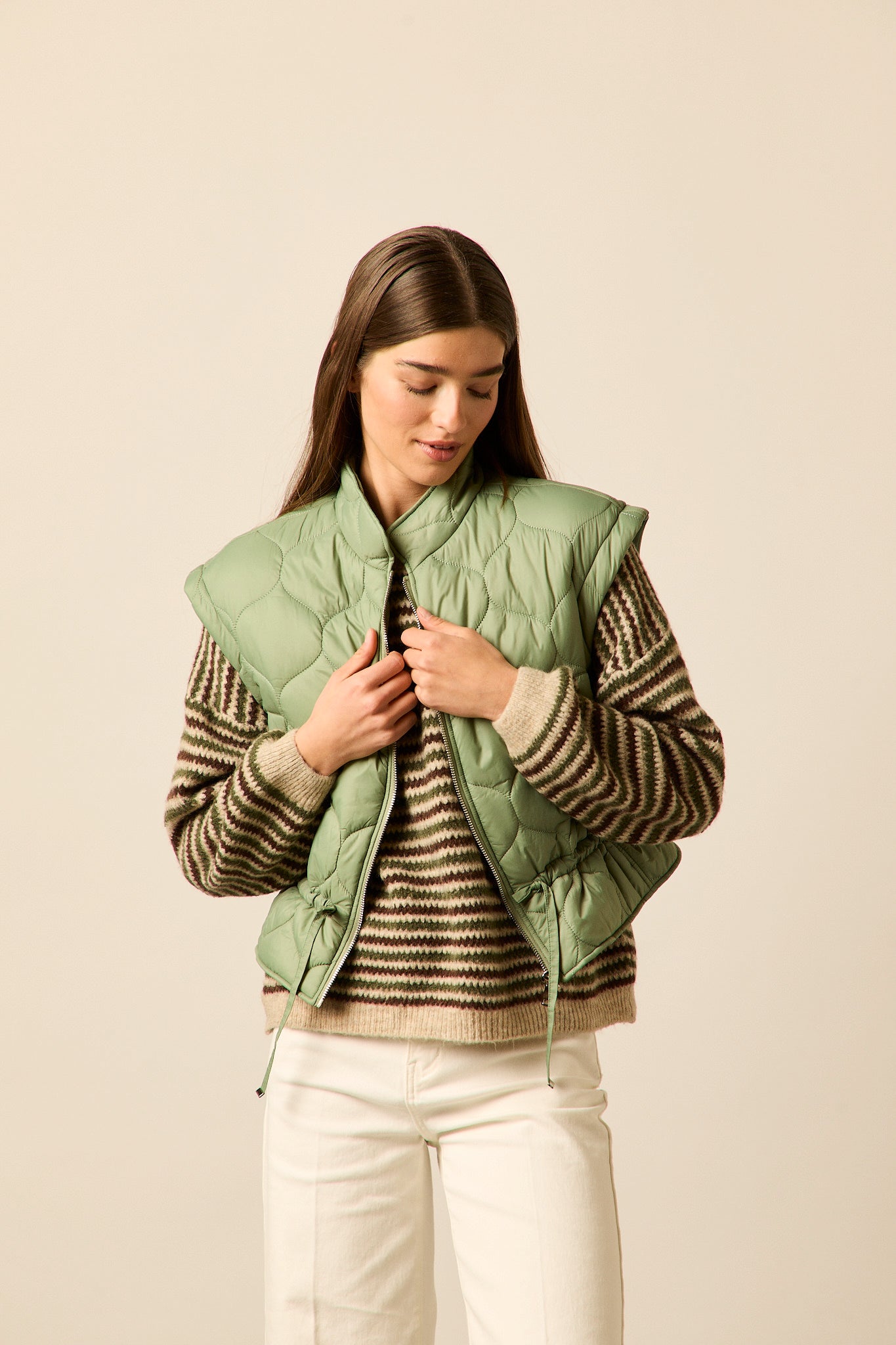 Chaleco acolchado en tono verde oliva con diseño de pespuntes curvos. Corte recto, cuello alto y cierre frontal con cremallera metálica. Incluye ajuste con cordón en la cintura para realzar la silueta.