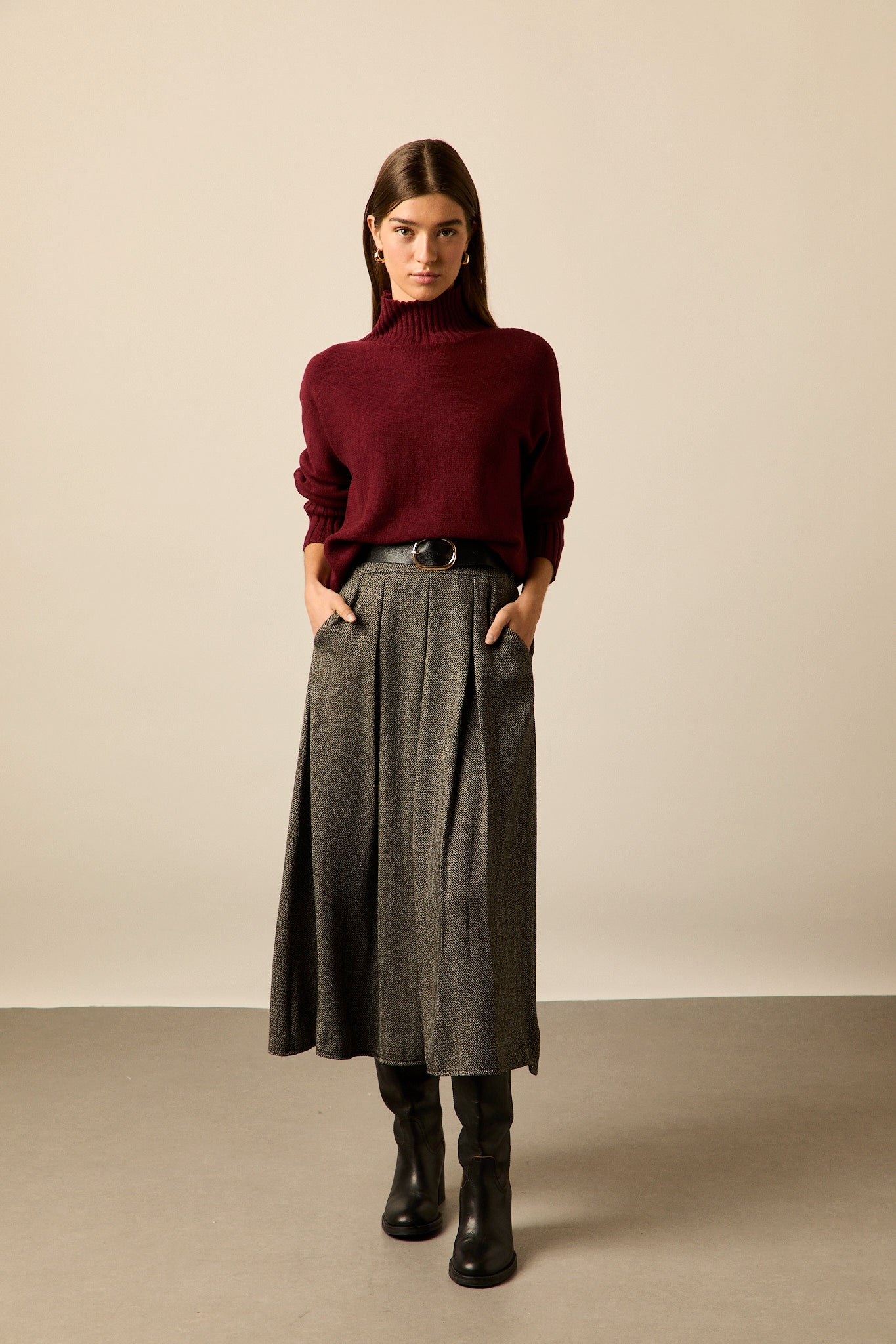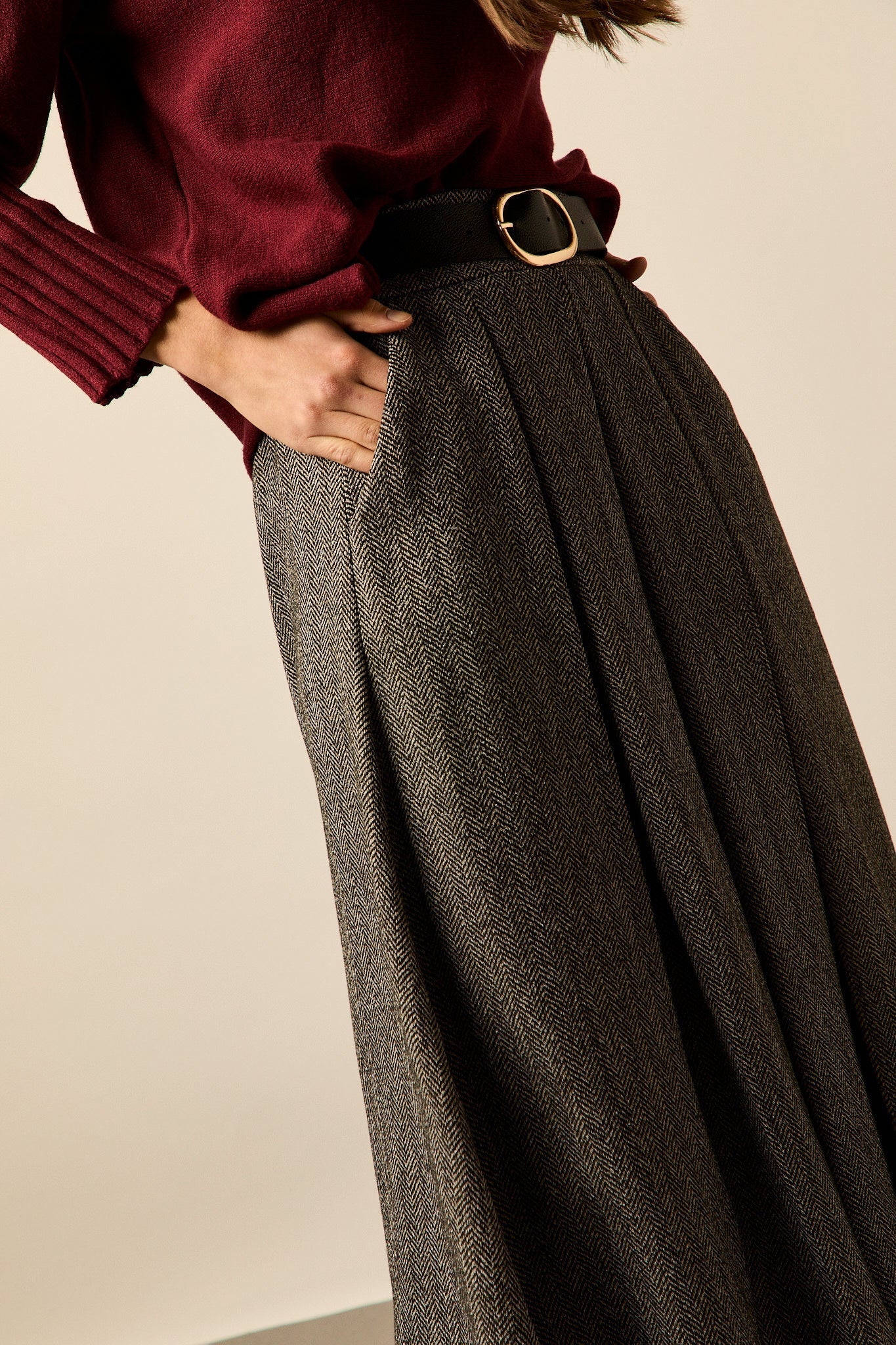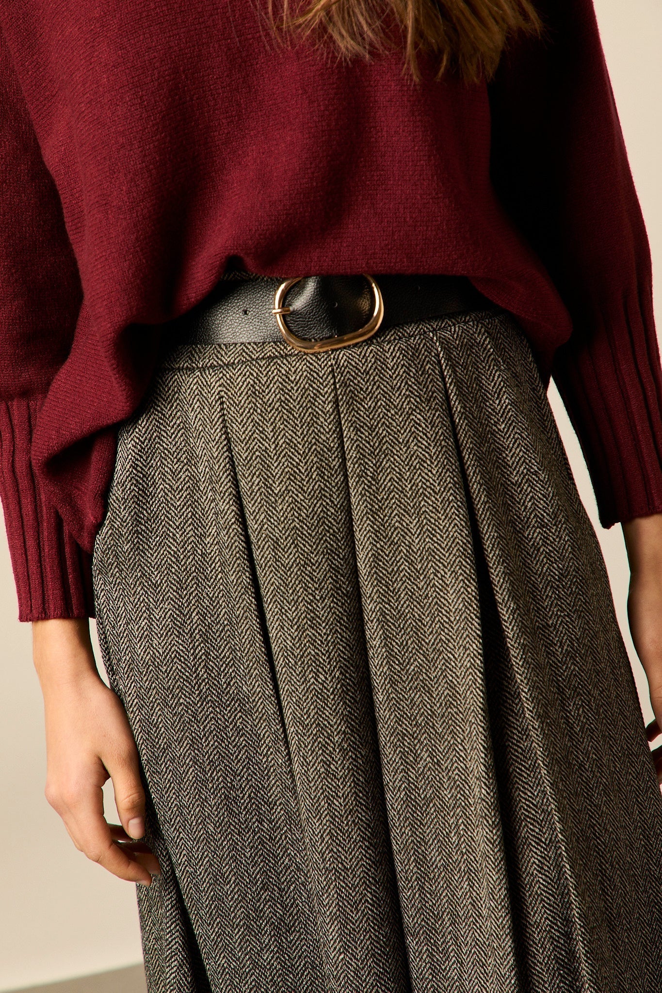 Falda midi de espiga en color gris. Tiro alto, cintura elástica, diseño recto con vuelo y cinturón en color negro.