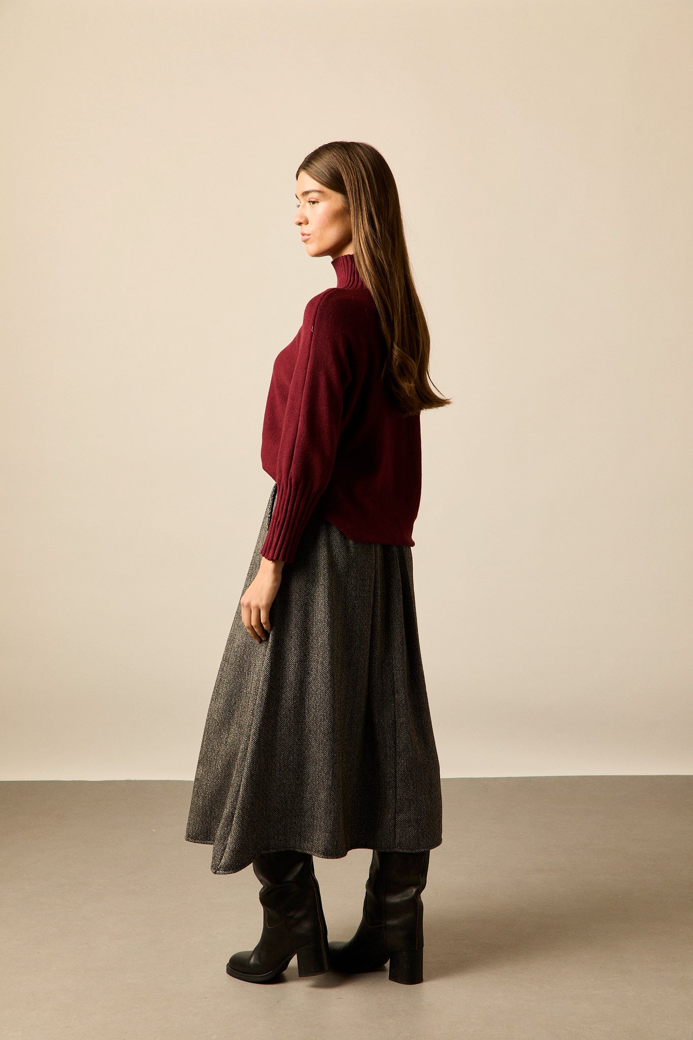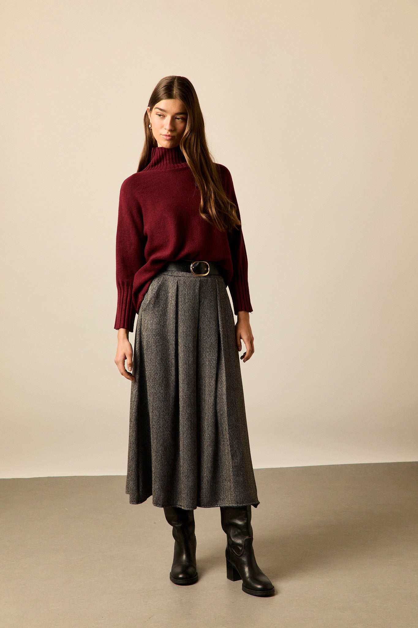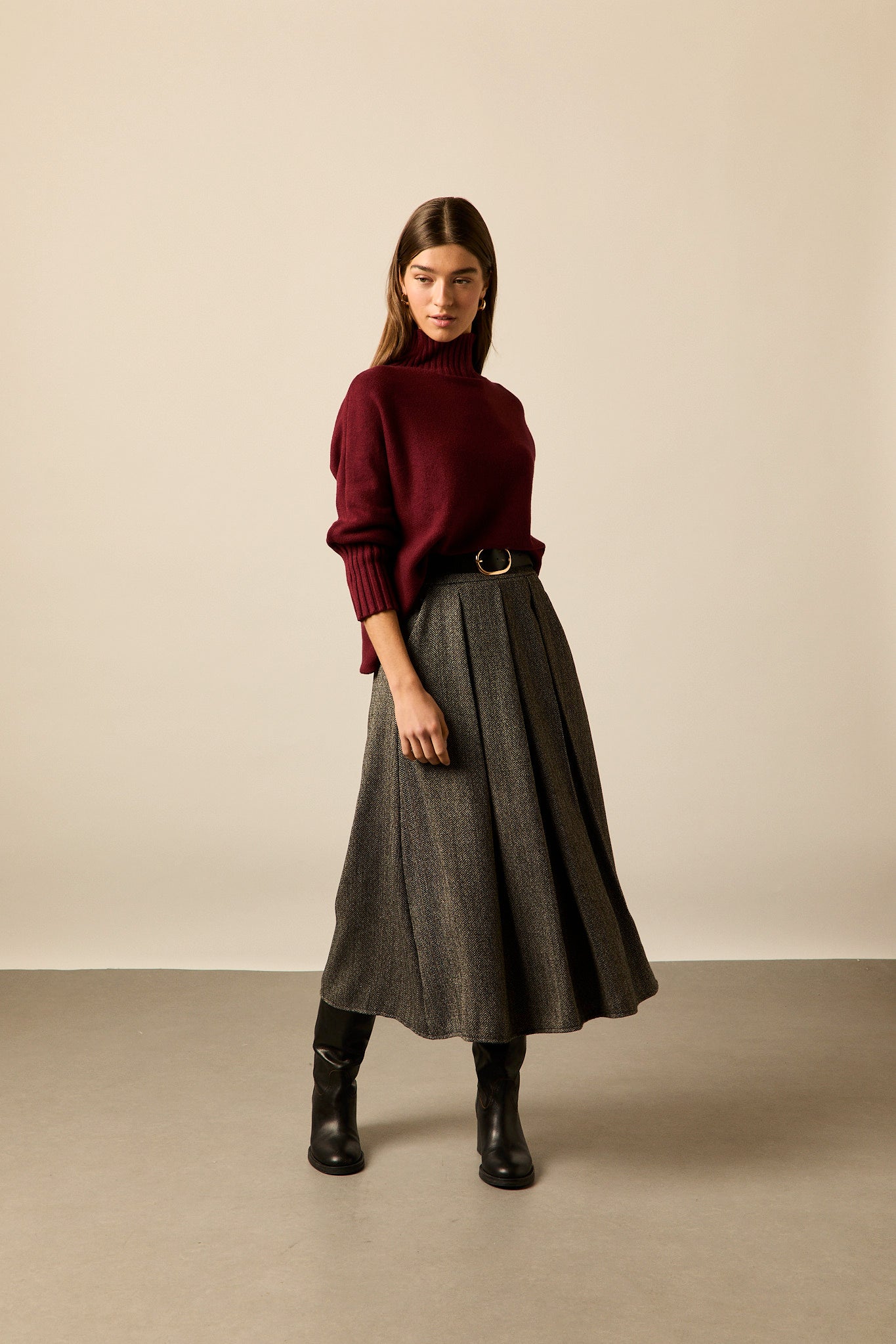 Falda midi de espiga en color gris. Tiro alto, cintura elástica, diseño recto con vuelo y cinturón en color negro.