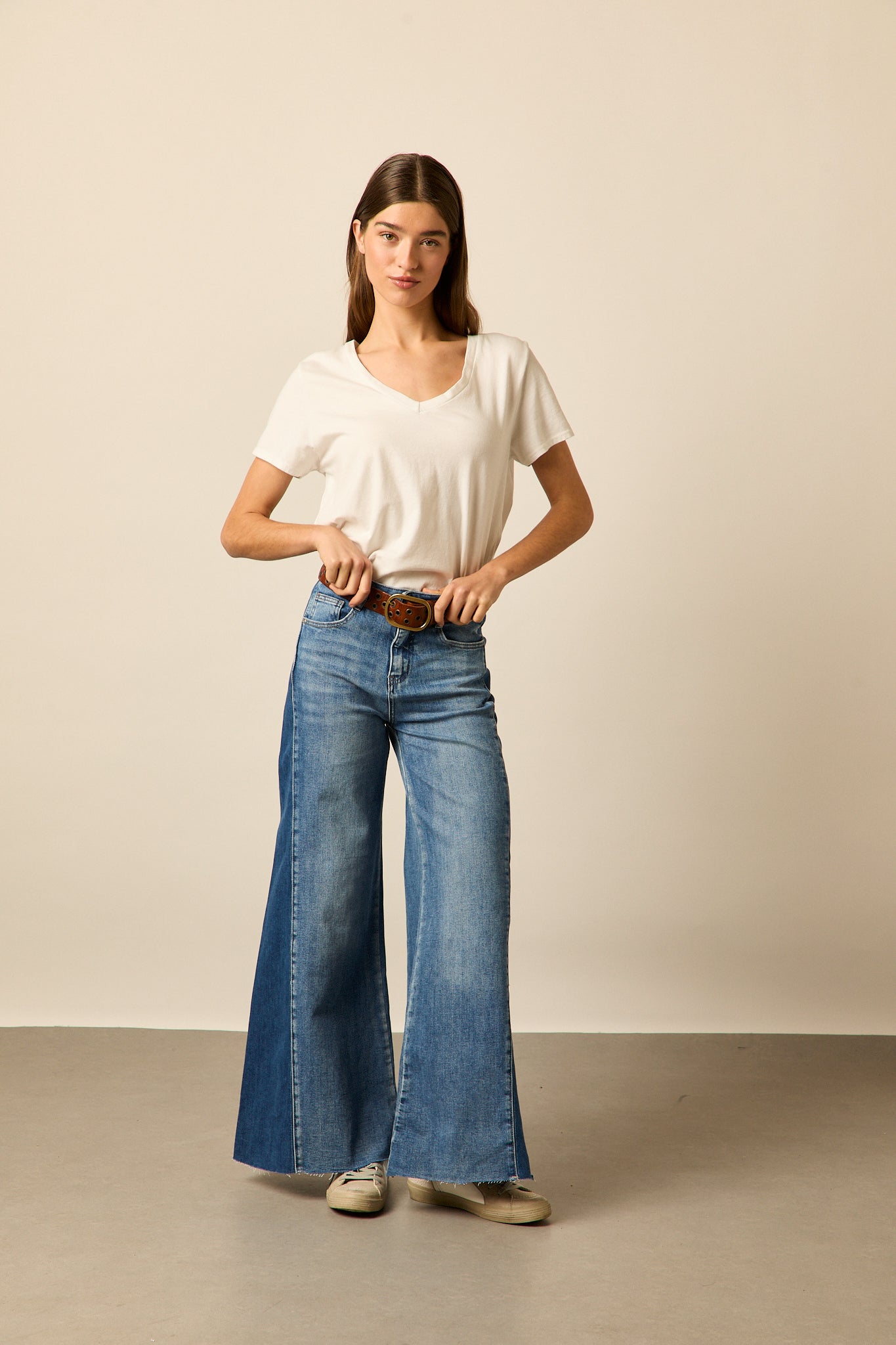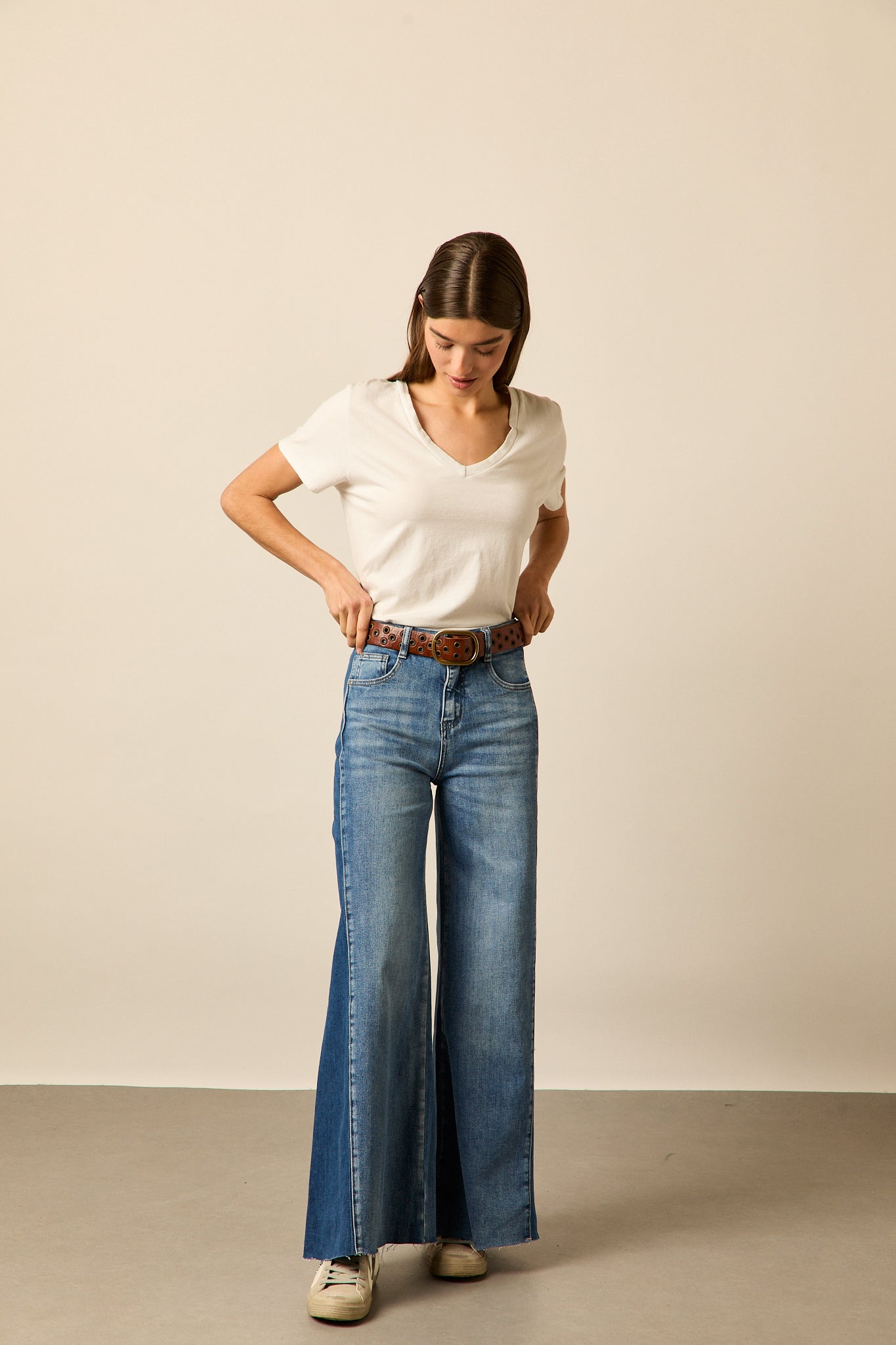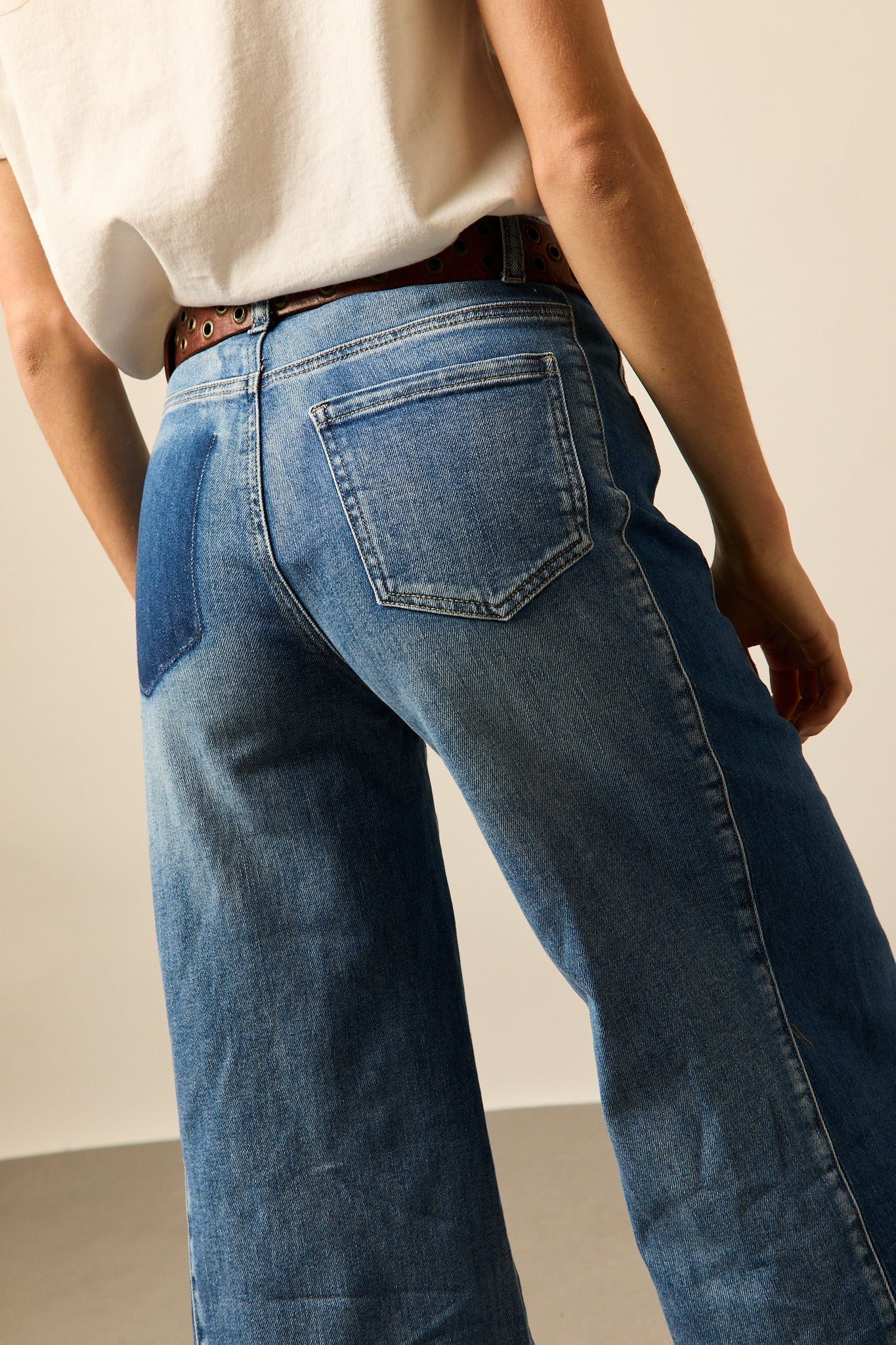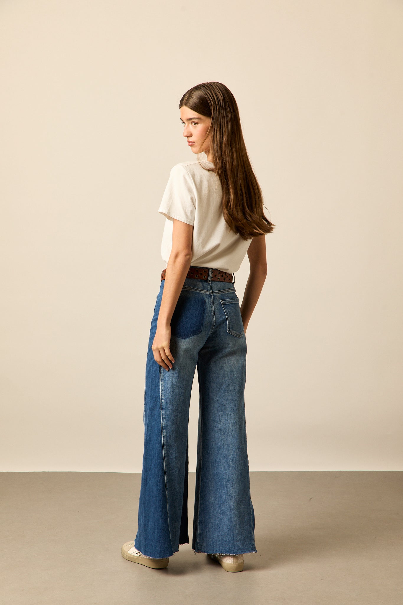 Jeans anchos bicolor en tonos azules. De talle alto, se ajustan en la cintura y cadera, con caída amplia hacia el dobladillo. Incluye un bolsillo trasero clásico y otro sombreado. Cierre frontal de cremallera y botón.