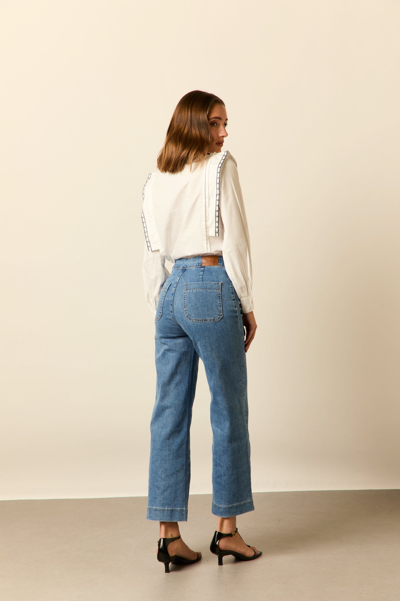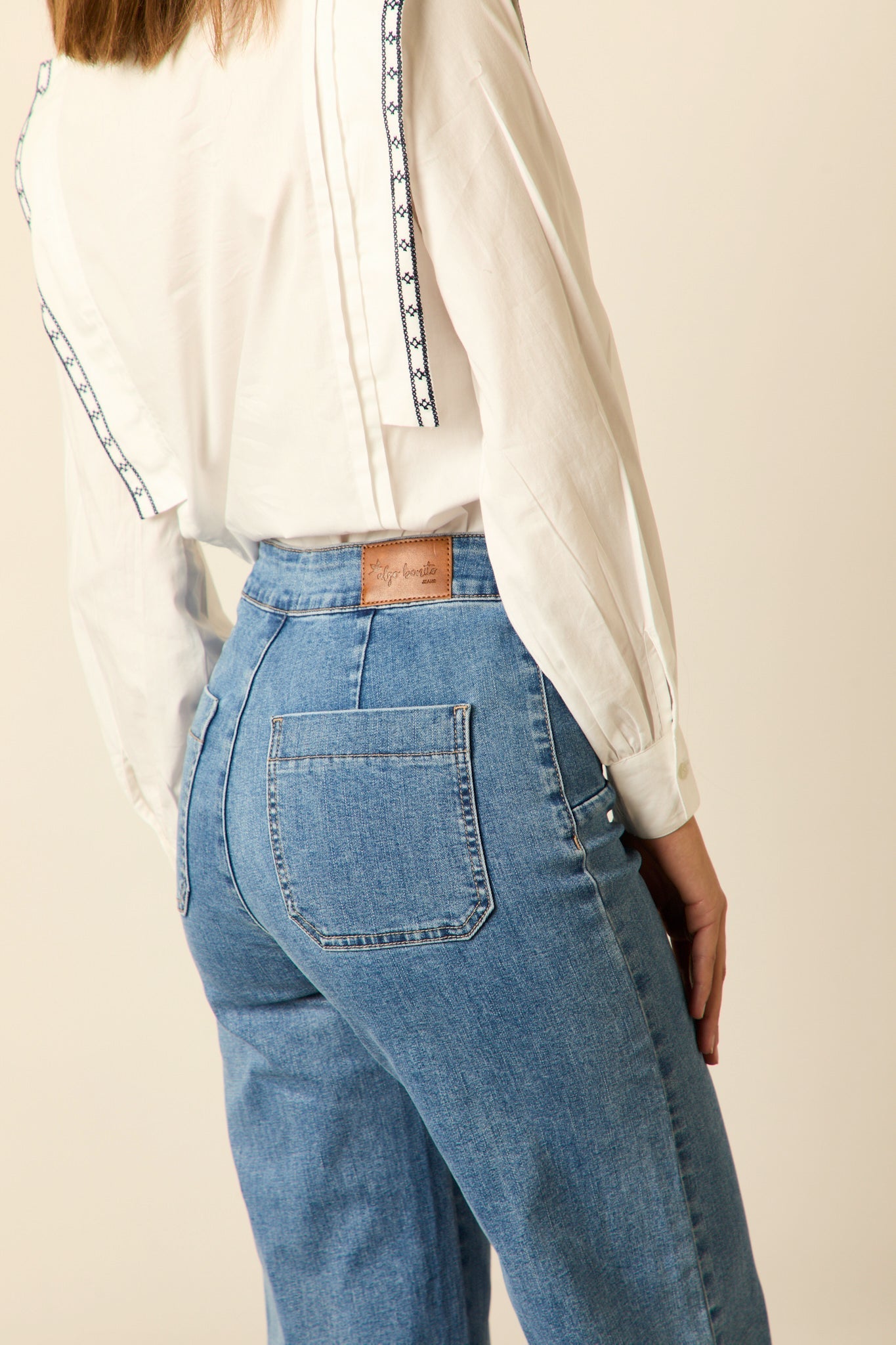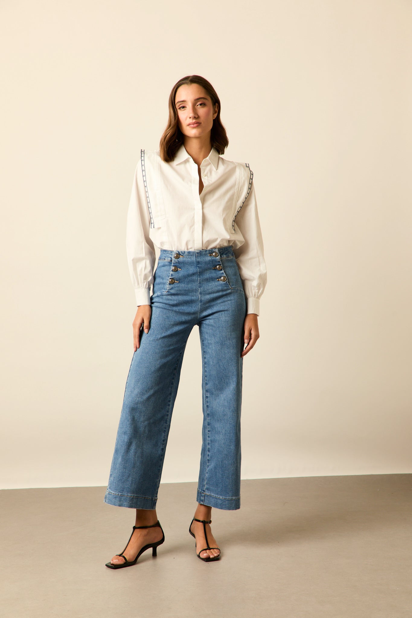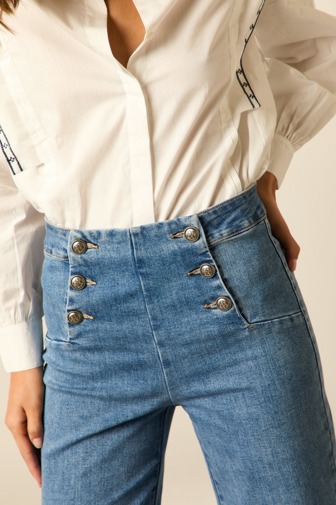 Jeans cropped estilo marinero en color azul. Tiro alto, detalle de seis botones frontal, pierna ancha bajo acampanado y dos bolsillos traseros.